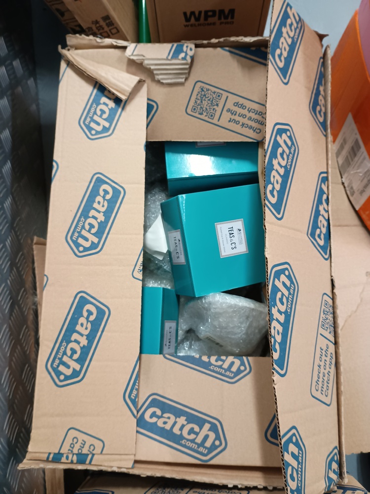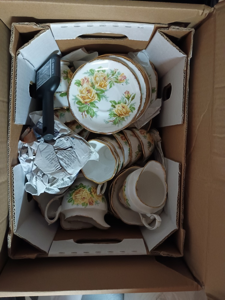 - Multiple boxes of cafe/catering crockery and equipment (tea cups, plastic containers, tea towels, soy candles, jars, boards)