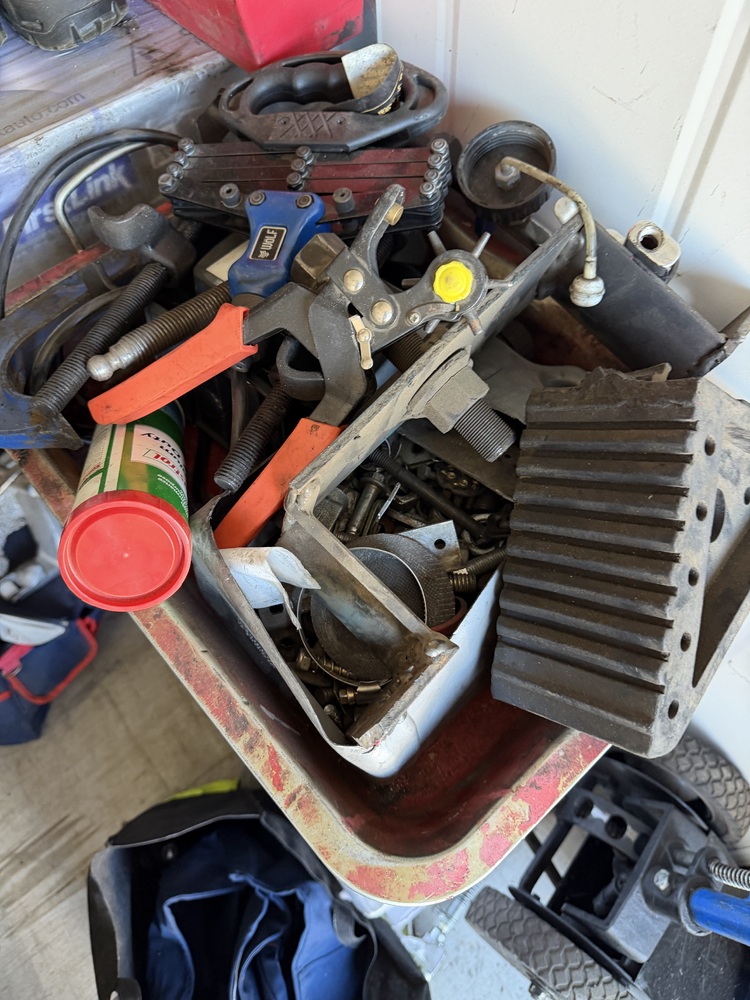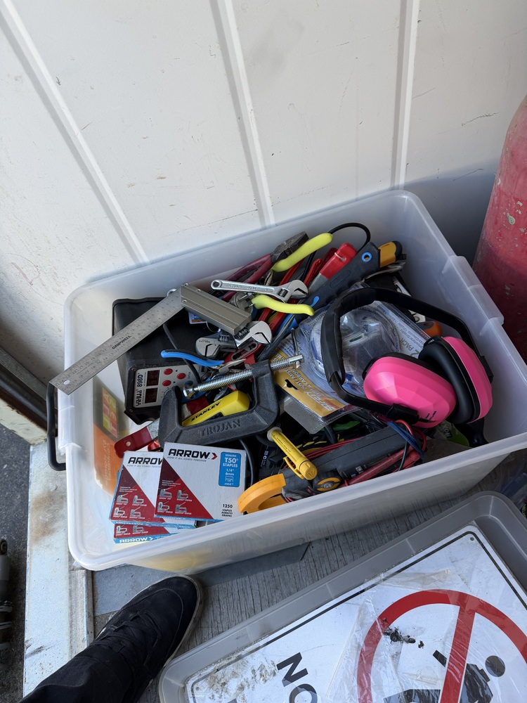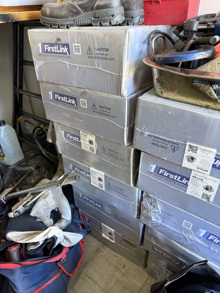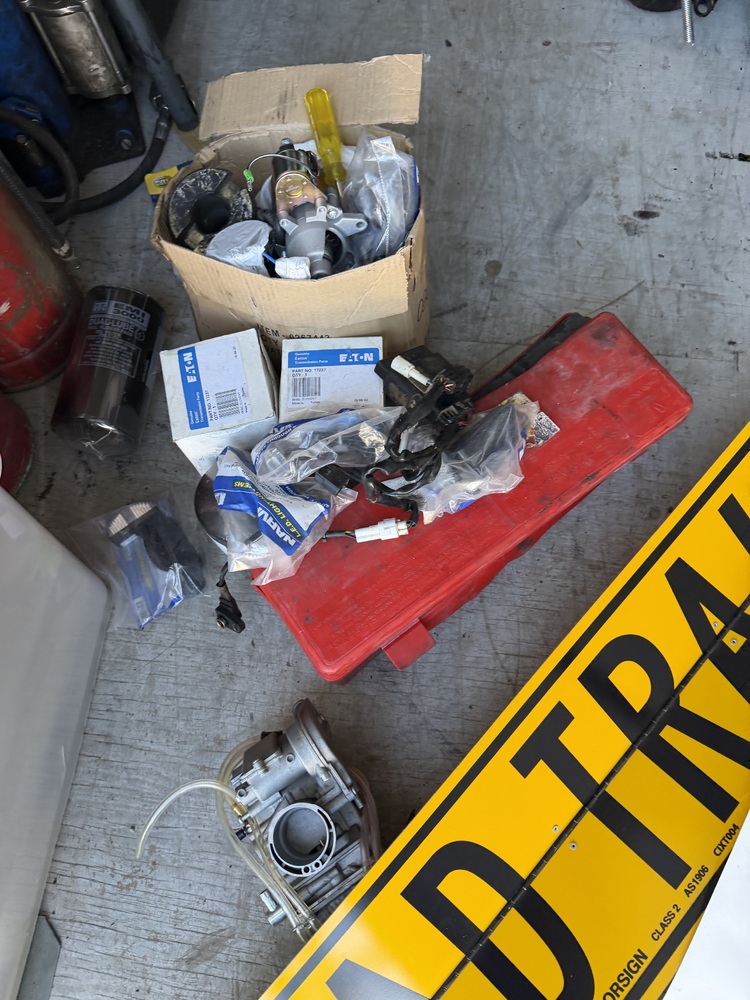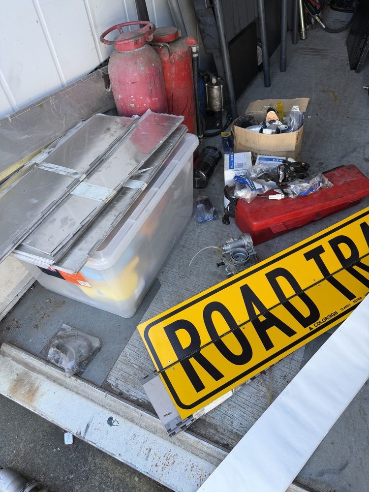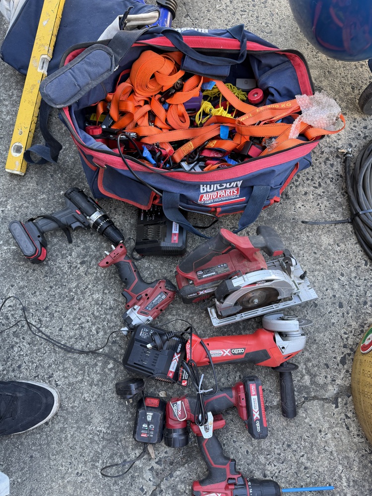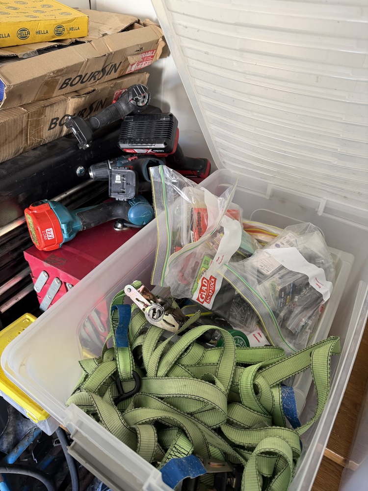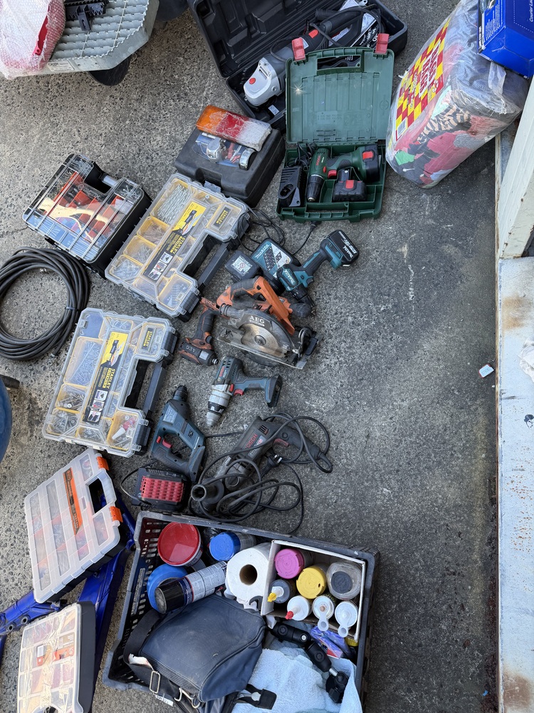 Various corded cordless tools all working Mixtures of hardware fasteners screws bolts Drill bits ratchet straps hand tools big mixture Trailer brake rotors brand new x15 oil filters Oil drum trolleys x2 Oil drum pump Drum of all purpose grease Rhino van shelving Trestles x2 small x2 big Roadtrain oversized truck signs Jacks Various paints adhesives silicones some used some new Yamaha 250 frame carby shock 2x removalist trolley Dyson vacuum works with Makita battery Sledgehammer Workshop rags