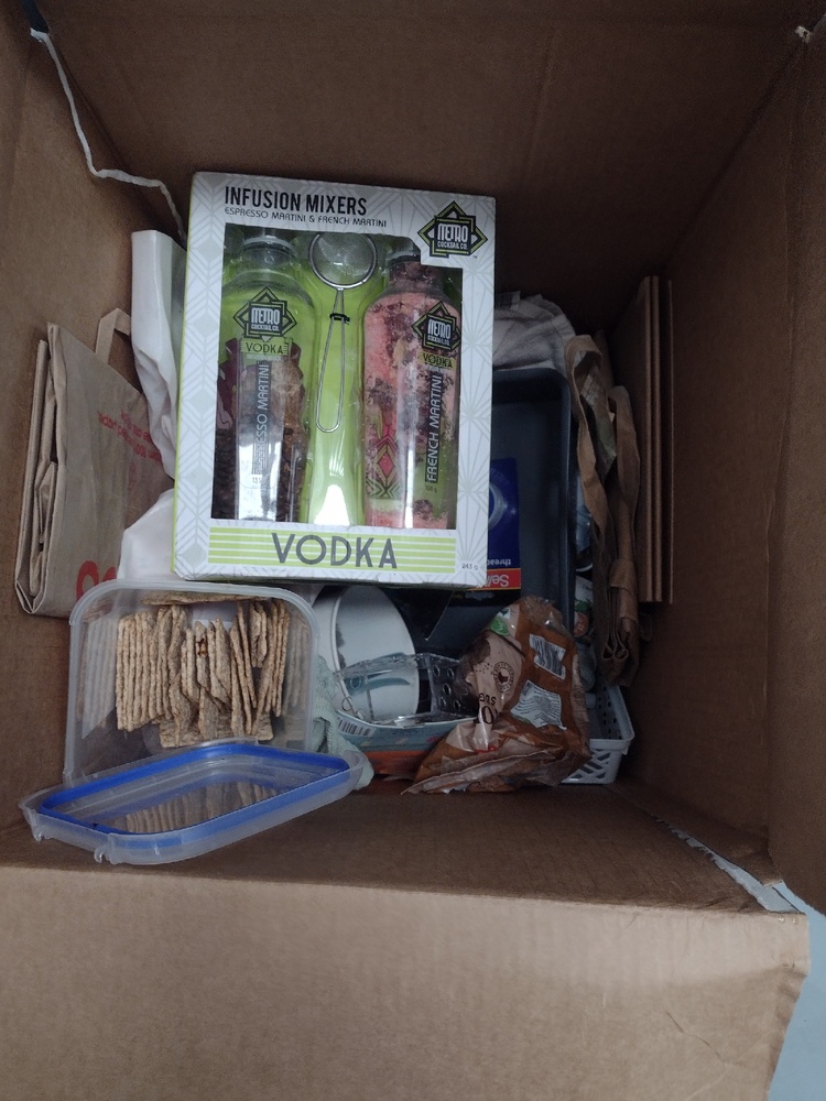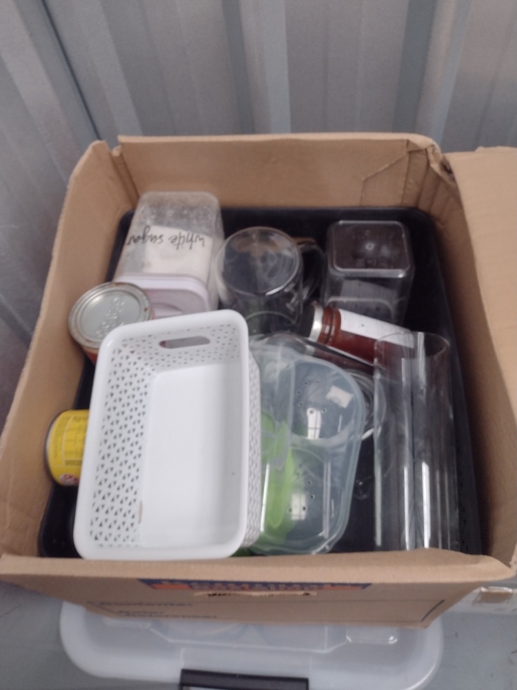 Tubs with assorted kitchenware