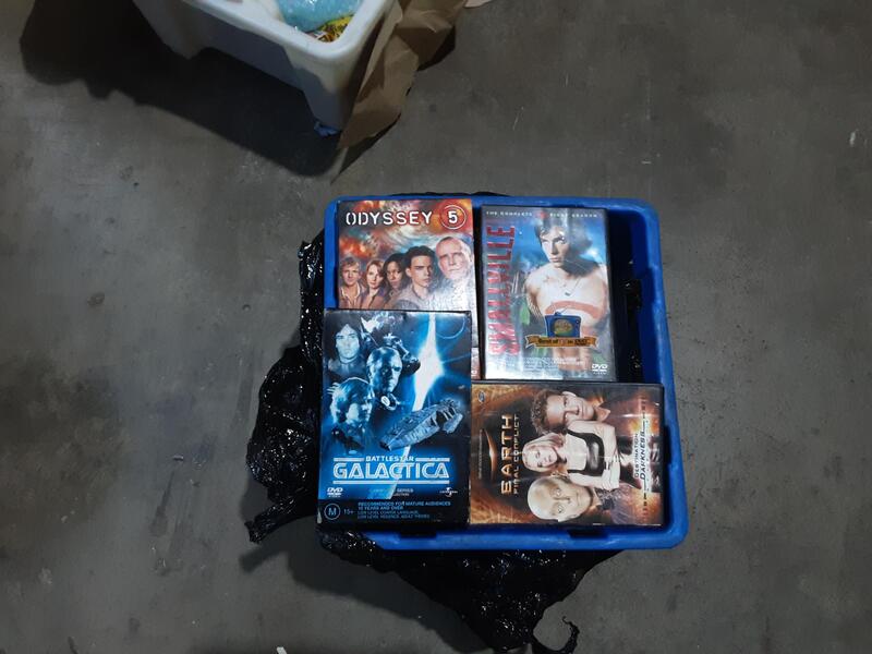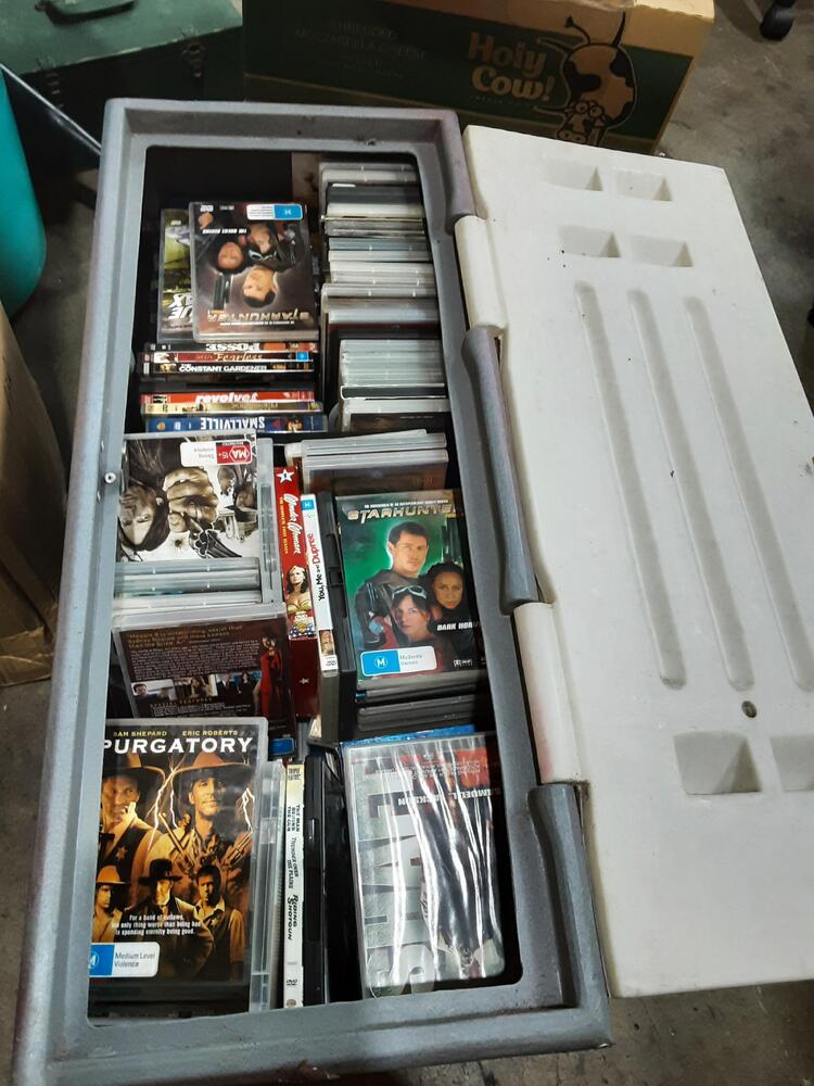 plastic storage crate x 3 (1 full of Dvd's, 1 full of paints and 1 full of misc)