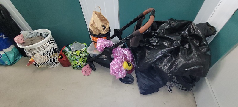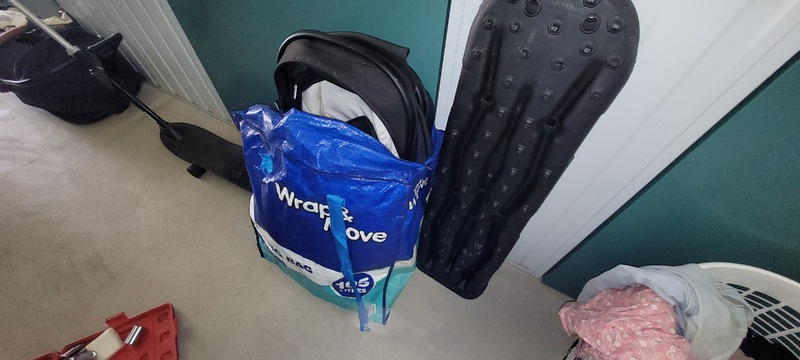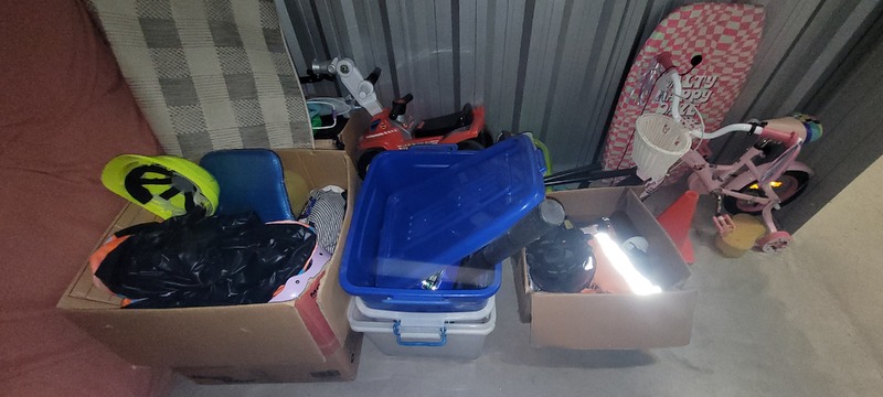 Bicycle, Socket set, Cot mattress, Scooter, Stroller w/bassinet, Car seat, Recovery skids x 2, Jerry can, Tarp, Swag, Assorted clothing, Kids BMX, Kids body board, Kids toys, Toyota rim/tyre x 2, Toyota windshield x 2, Assorted garden tools, Assorted stack hats, Bedside x 2, Tallboy, Mattress, Rug, Assorted plastic containers, Tie, Rope, Cycling helmet, Assorted household items & Assorted manchester.