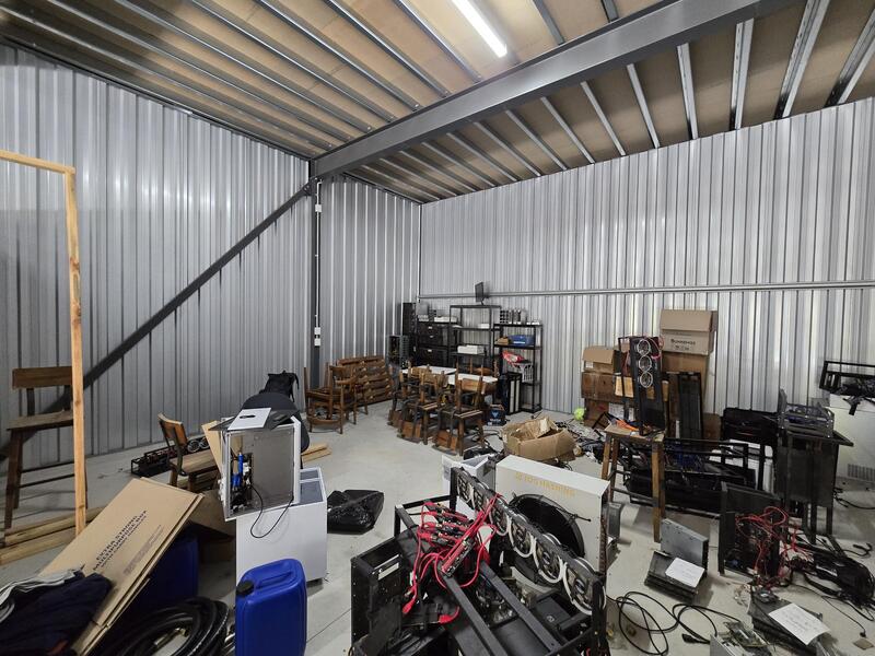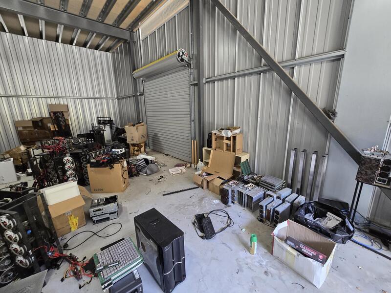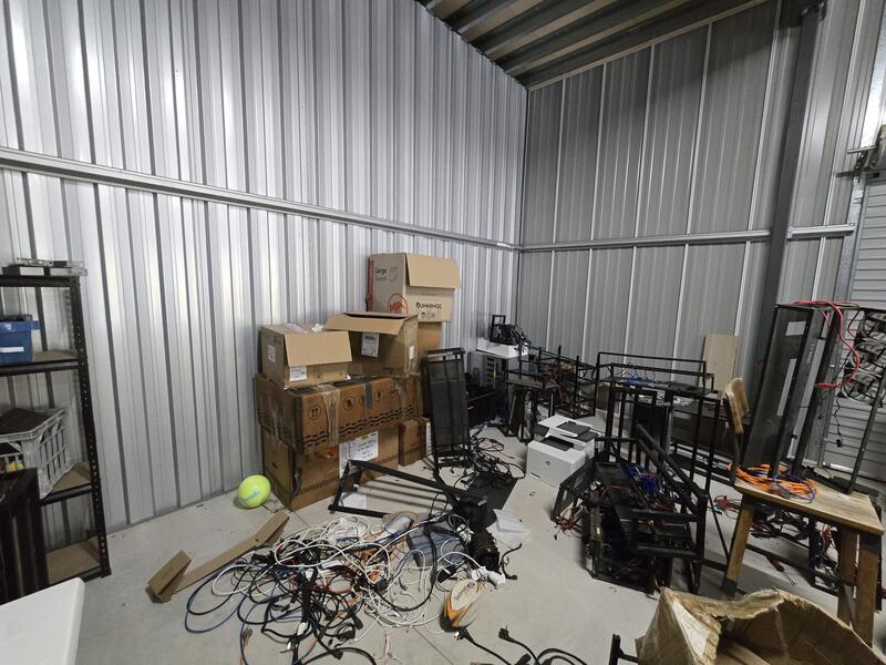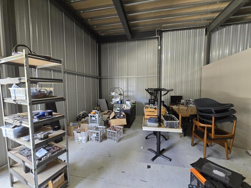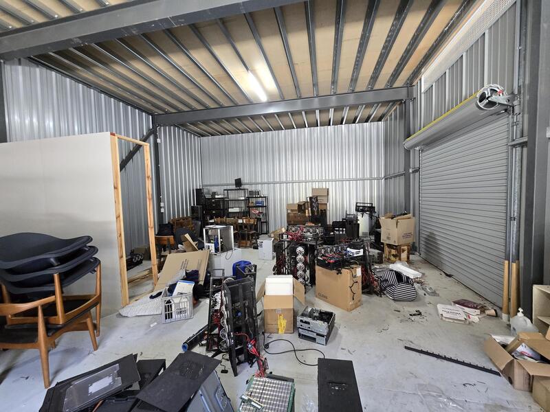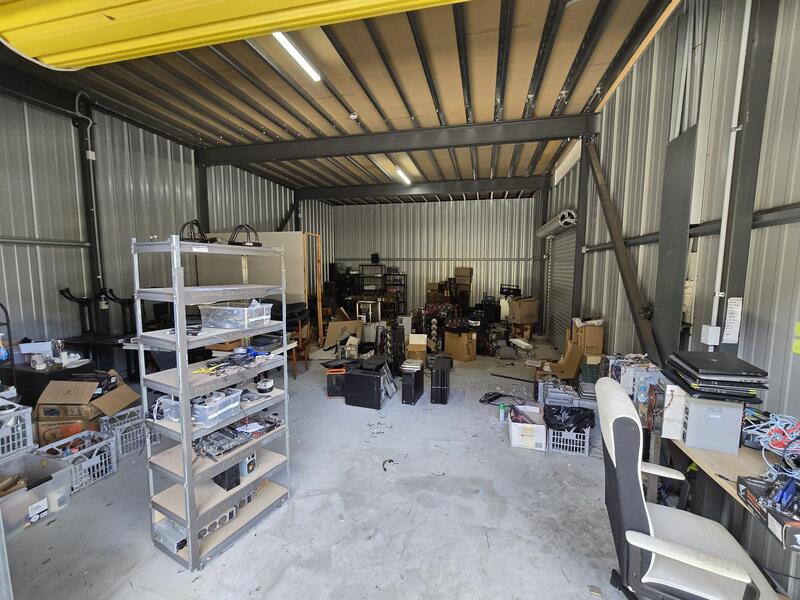 The unit listed is sold as is with the entire contents, including broken-down computers, computer parts, tables, chairs, and shelving units.