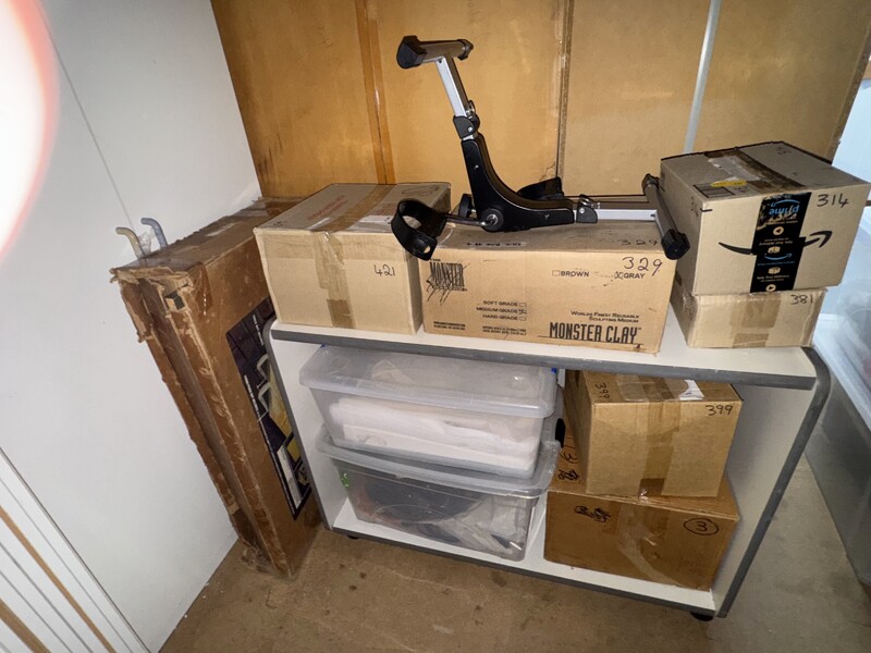 Other items include, golf buggy, carpet cleaner, old fishing rods and reels, PVR, Yamaha Receiver, 4 rolls of packaging foam, packing tape, ski ropes, coil springs, transmission surge arresters, hardware, tools, Garage Wall Shelf Bench – older but still in box.