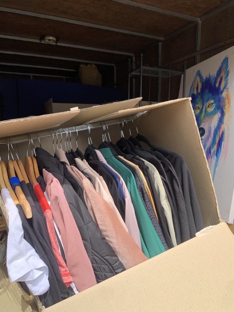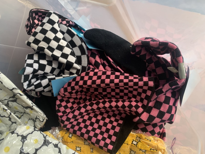 1x box full of new clothes with tags!!! Approximately 85 pieces including ladies Summer dresses various sizes and winter beanies and hats.