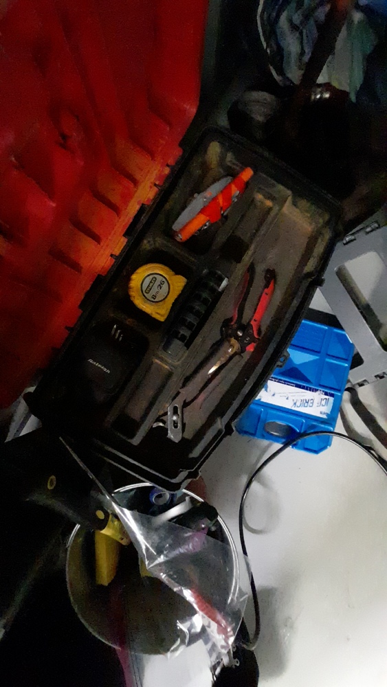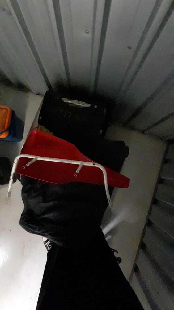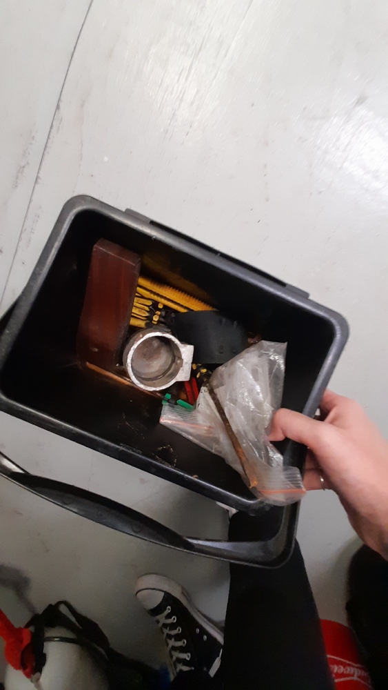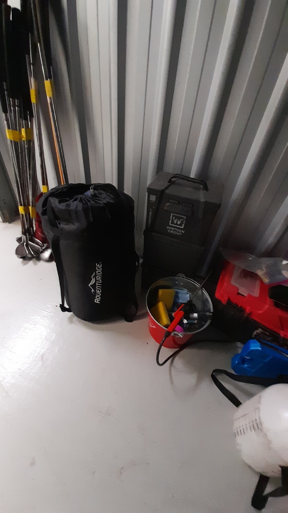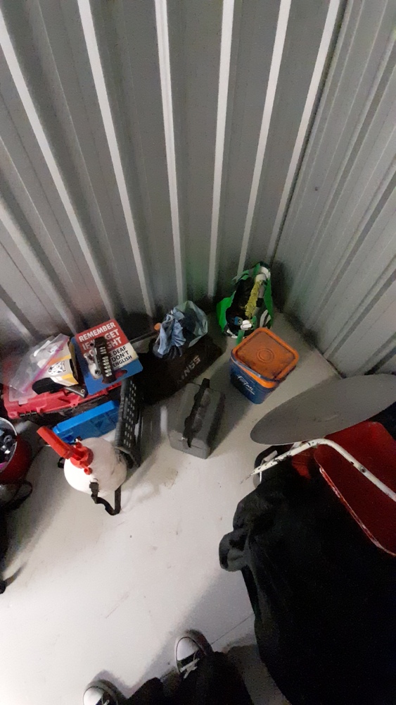 Golf clubs, tool box with tools, nuts and bolts, possible tent or swag, street signs, fertiliser pump, Eskies.