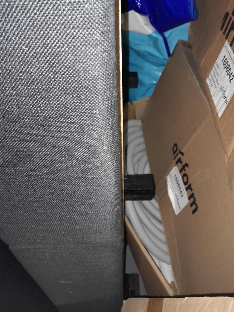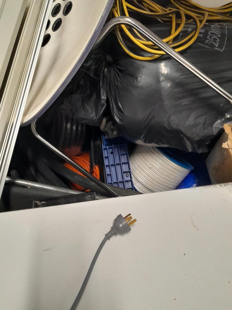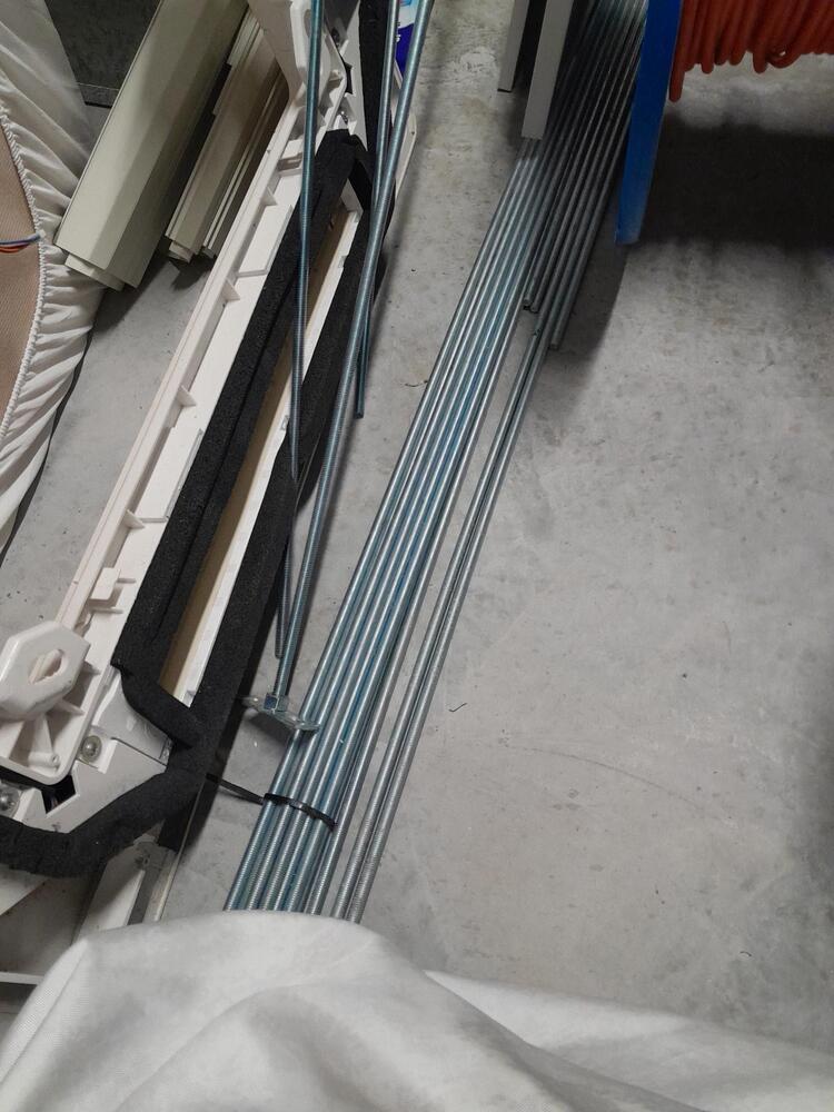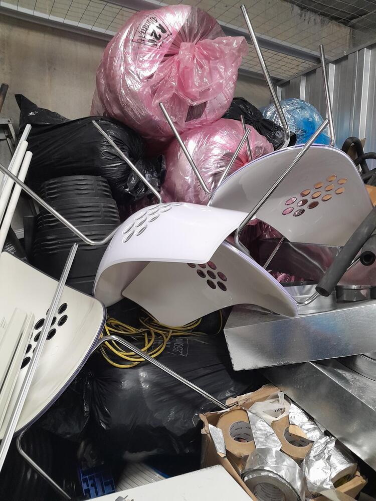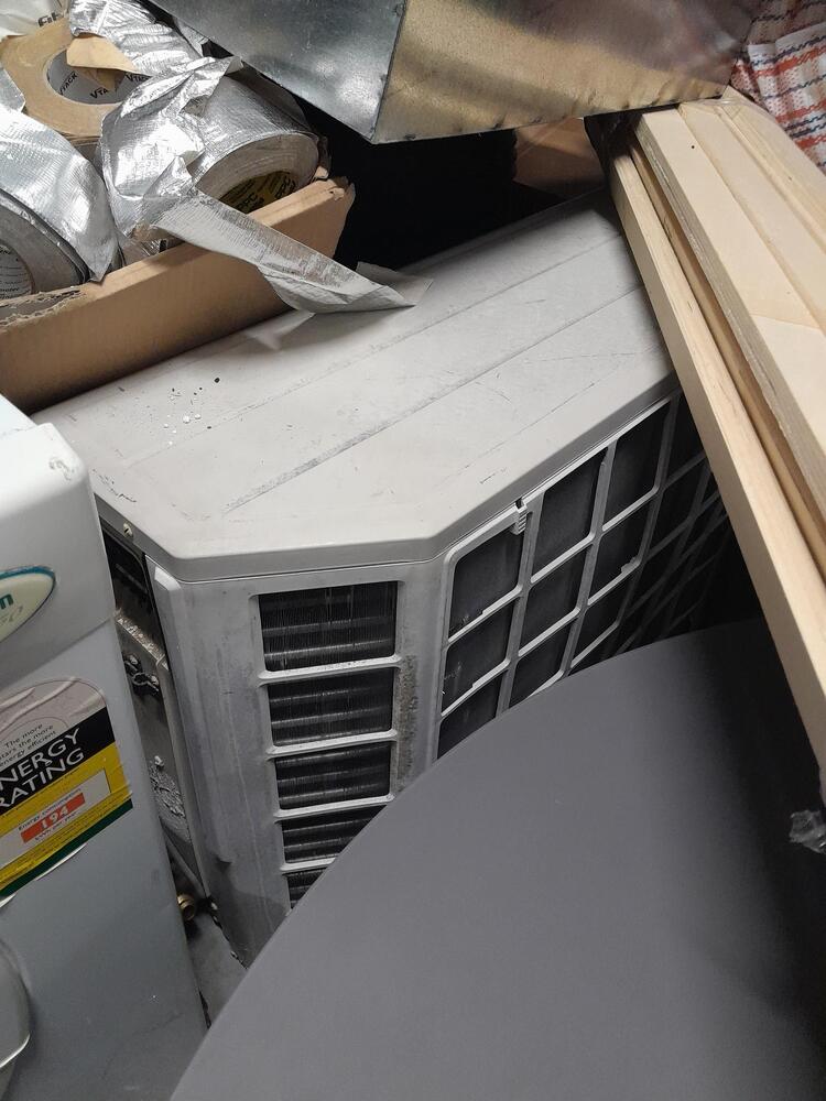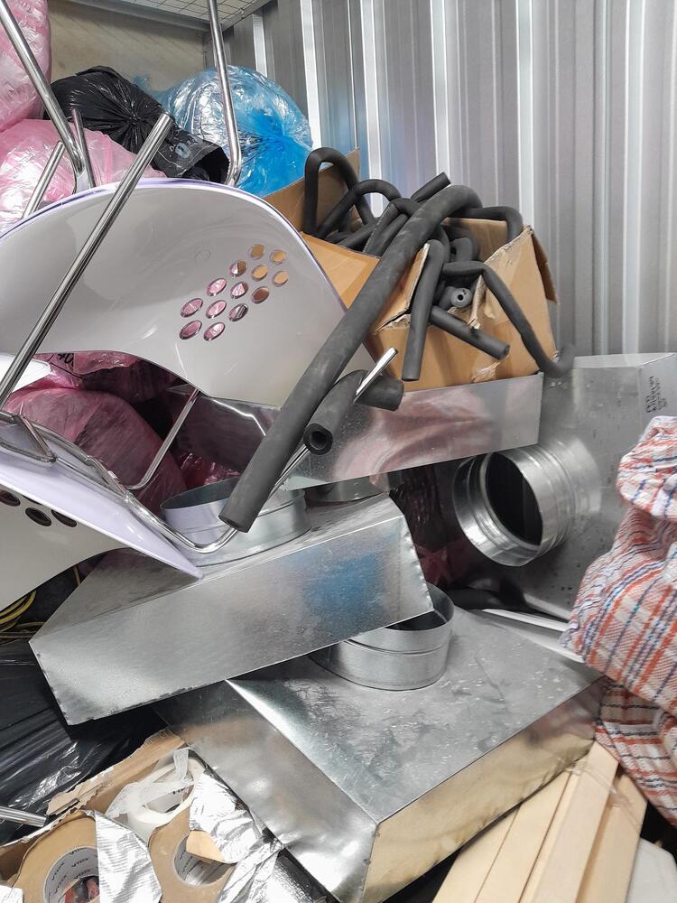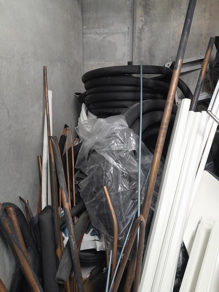 Bed, base and mattress, air conditioning units, ducting, piping, pipe insulation, air con registers, air con dampers, rolls of cable, threaded rod, 4 x chairs and adjustable table (coffee/dining) flexible conduit, scrap copper pipe, clothes drier, electric blender