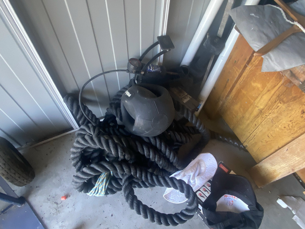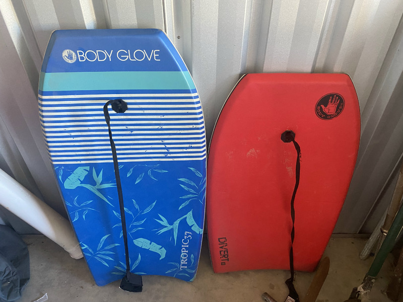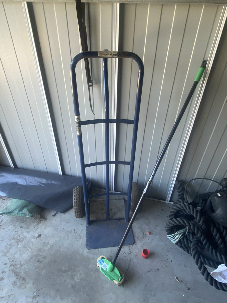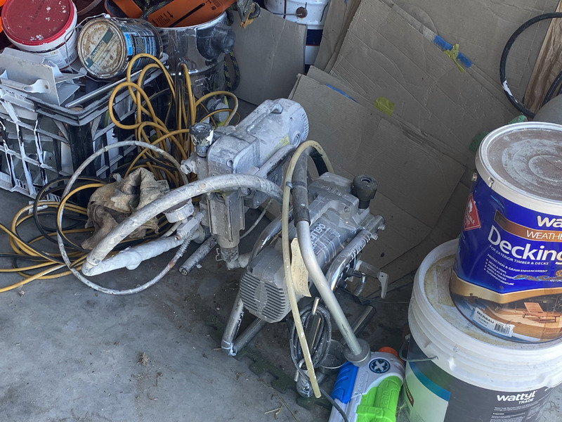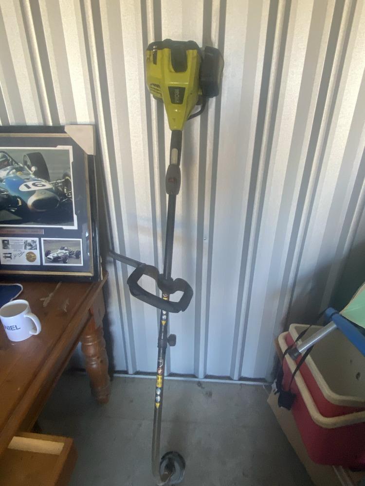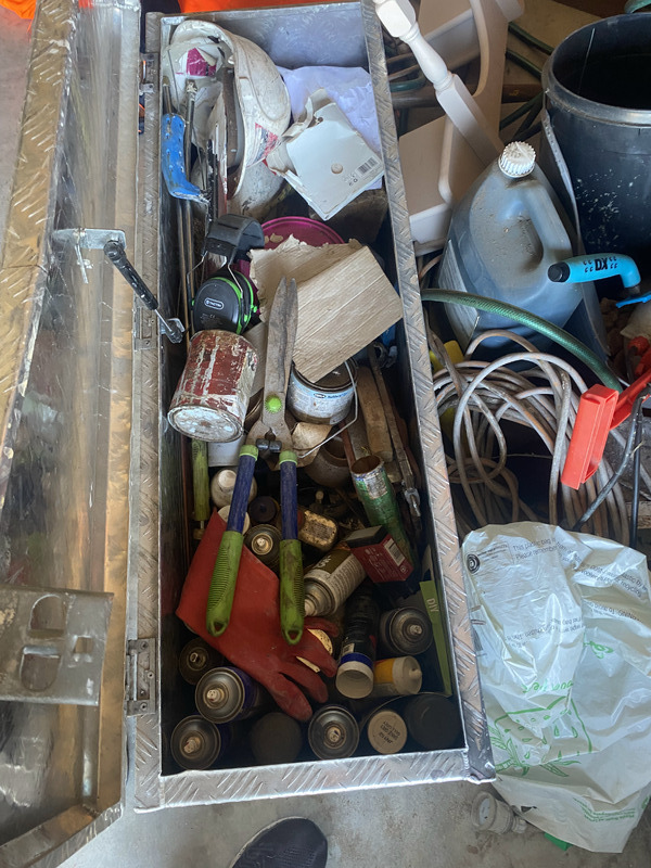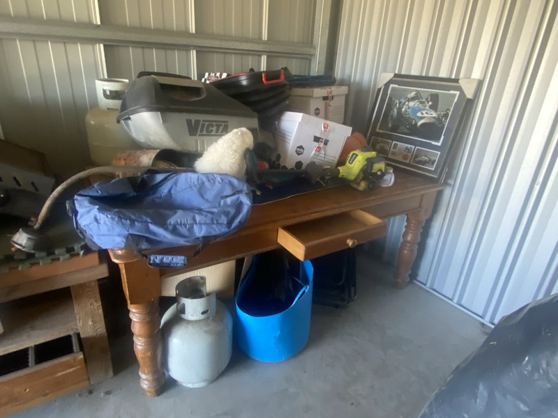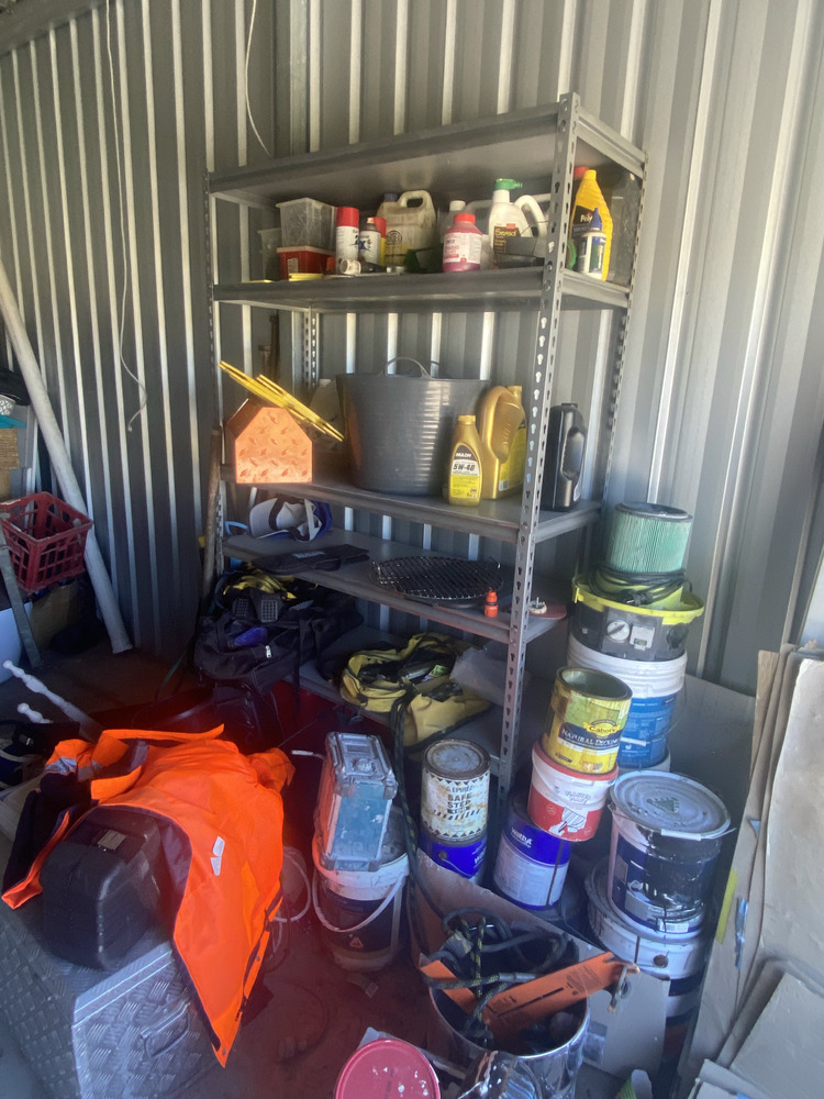 Paint Spray Gun Equipment, Assorted Paints, Jack Brabham Framed Print, 2 pairs of Flippers (one with Goggles), Retro Slushie Unit, 3 Boogie Boards, 1 Foam small surf board, Timber Cabinets x 2, Trolley, Metal Racking, 2 x Gas Bottles, Work Radio, Assorted Screws, Containers, Loose Metal Shelving, Exercise rope and weights, Mower Catcher, Plastic Table, Ryobi Edger, BBQ Plate, Exercise trampoline, Dual Saw, Metal toolbox with assorted tins / spray cans.