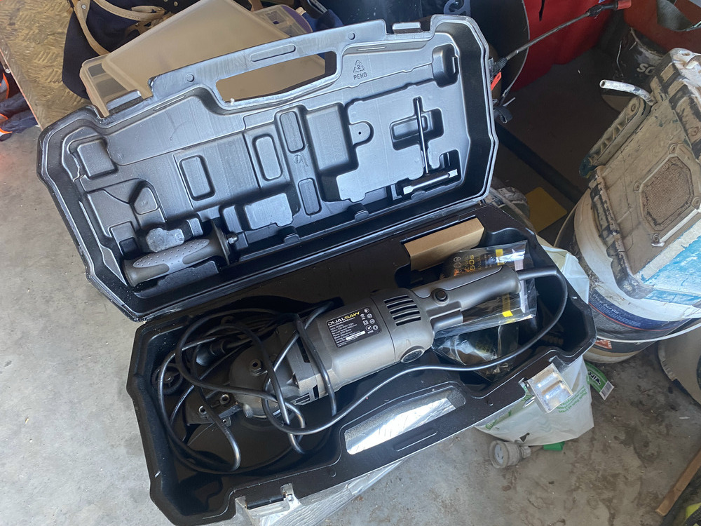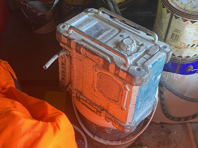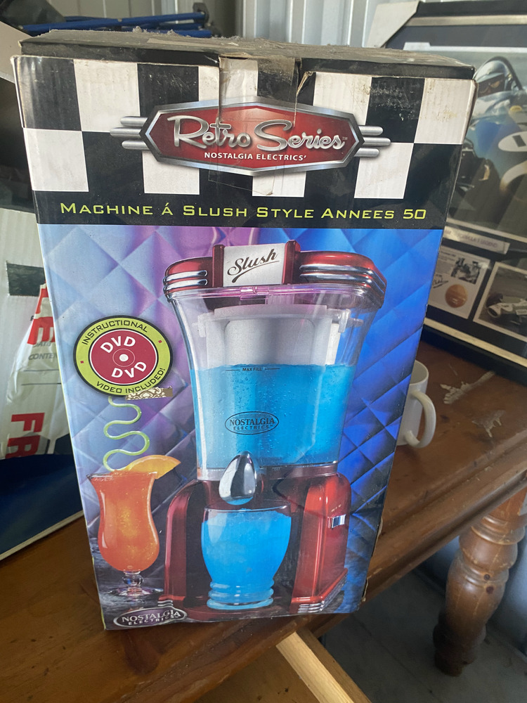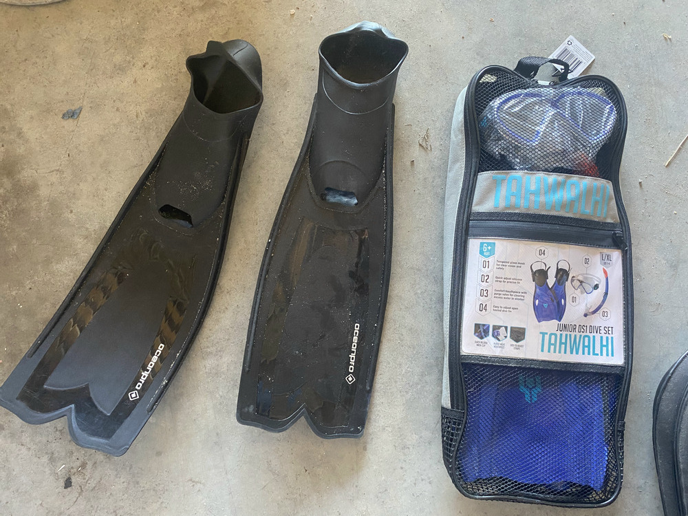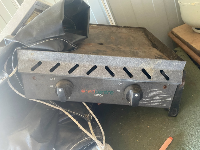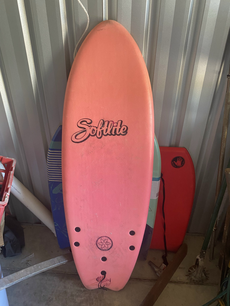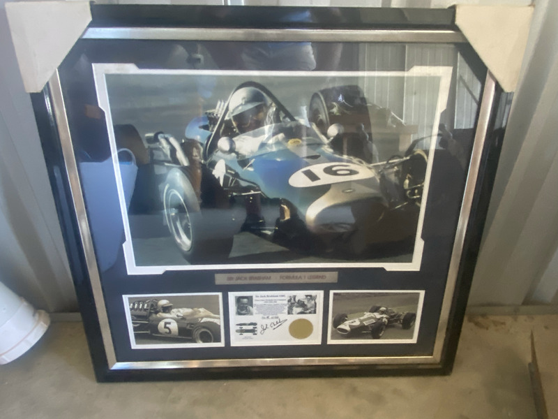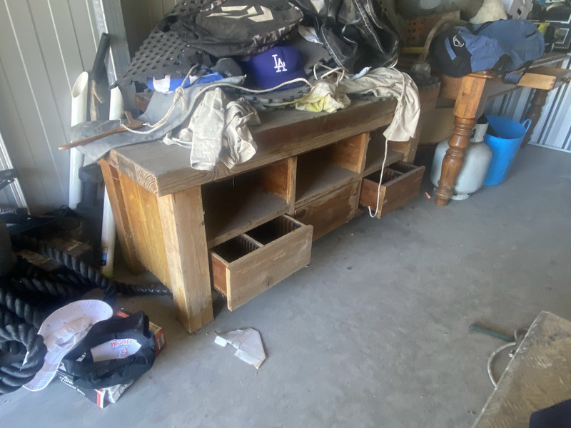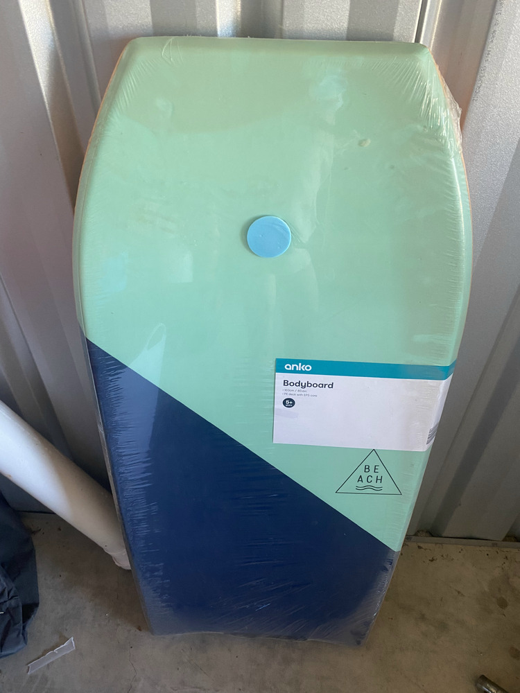 Paint Spray Gun Equipment, Assorted Paints, Jack Brabham Framed Print, 2 pairs of Flippers (one with Goggles), Retro Slushie Unit, 3 Boogie Boards, 1 Foam small surf board, Timber Cabinets x 2, Trolley, Metal Racking, 2 x Gas Bottles, Work Radio, Assorted Screws, Containers, Loose Metal Shelving, Exercise rope and weights, Mower Catcher, Plastic Table, Ryobi Edger, BBQ Plate, Exercise trampoline, Dual Saw, Metal toolbox with assorted tins / spray cans.
