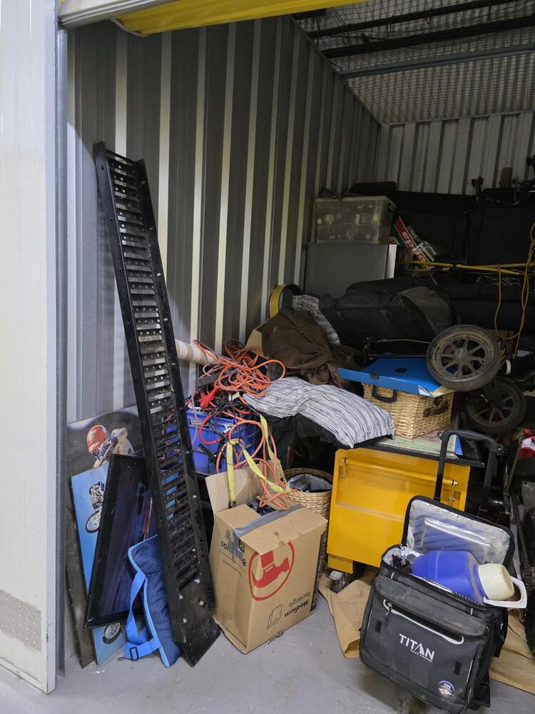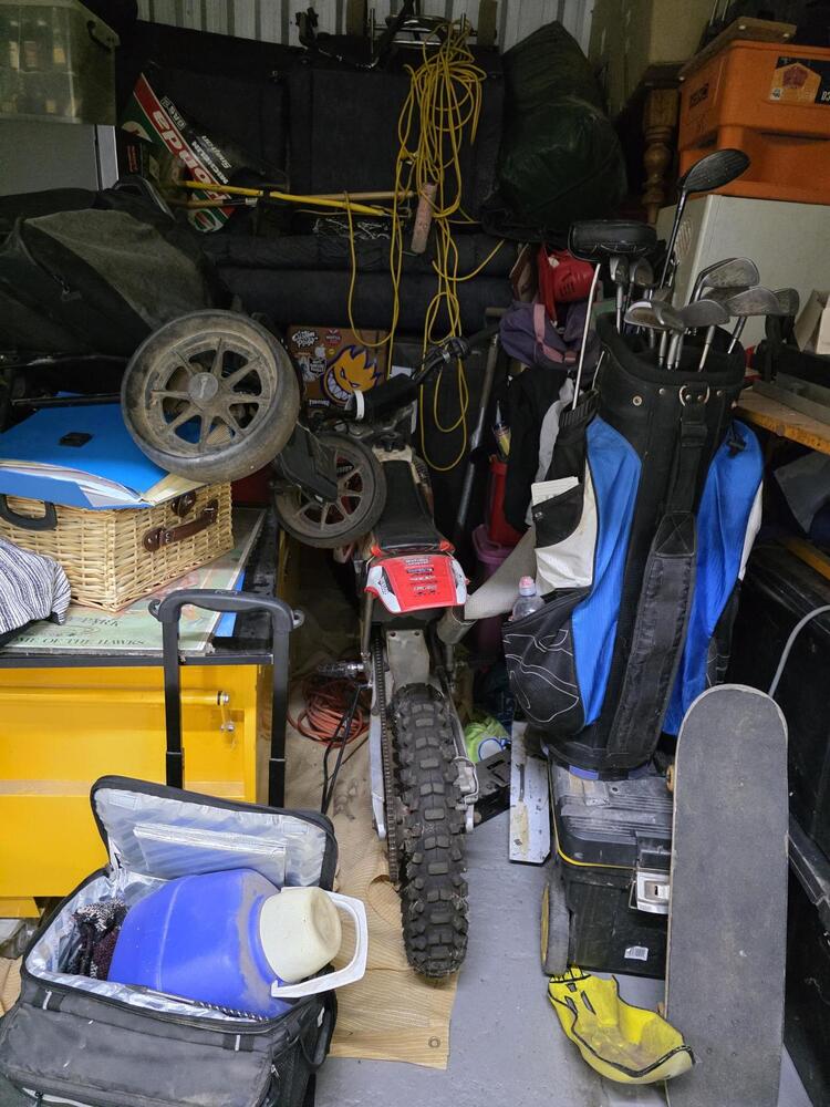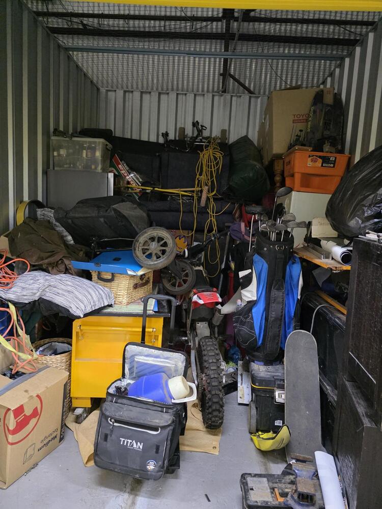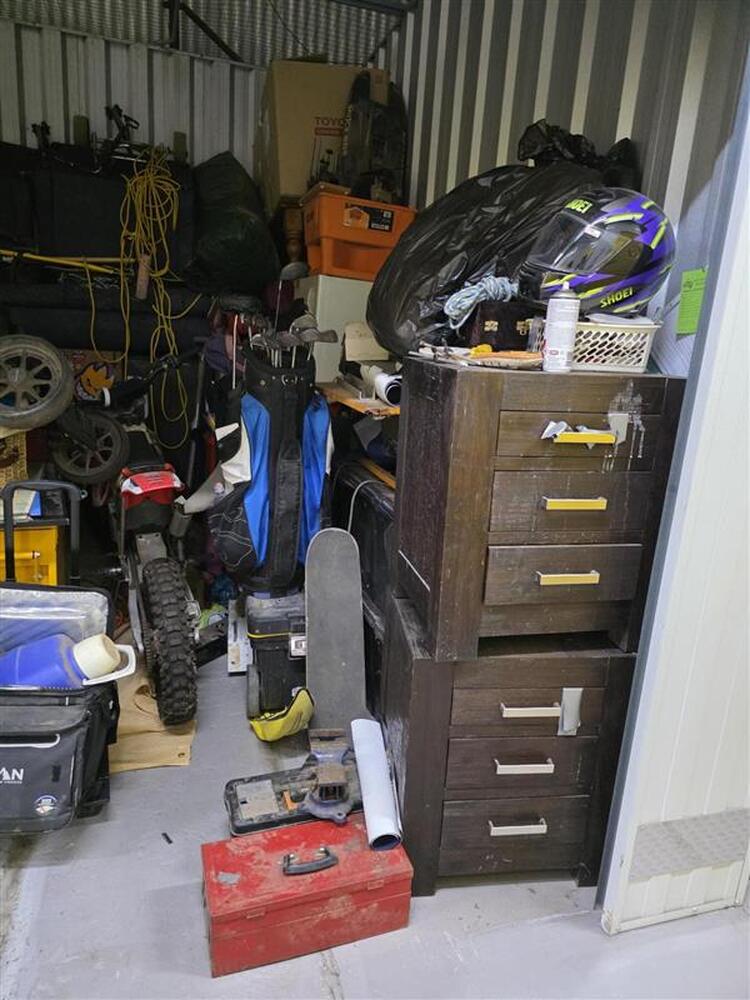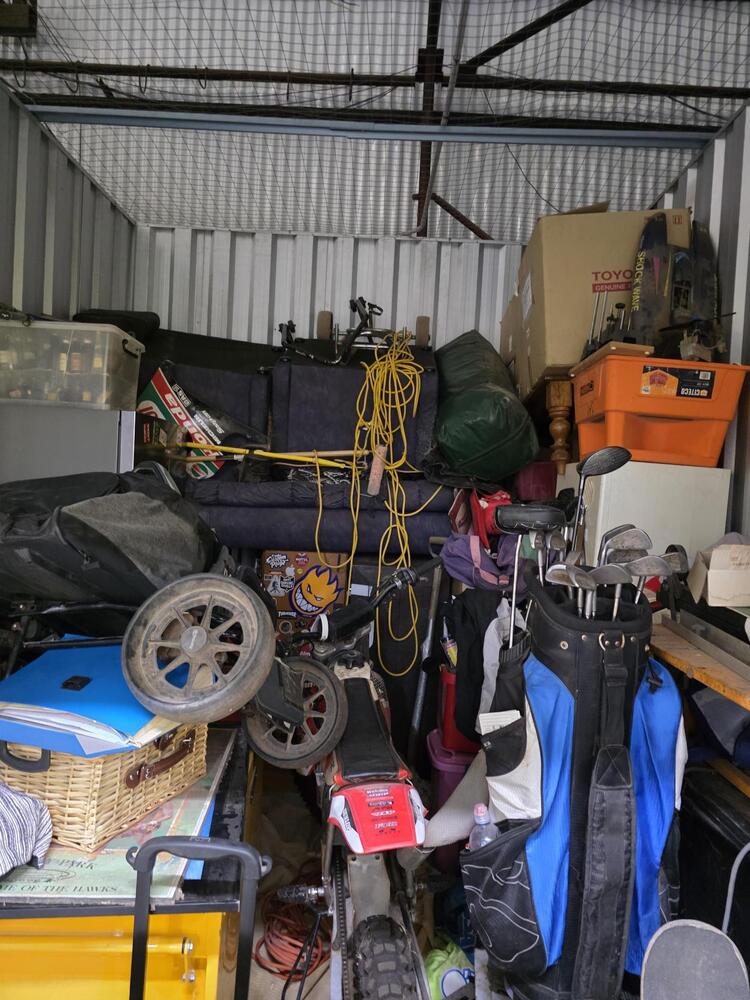 From what we can see inside this unit we have, toolboxes, Shelving, a motorbike, multiple golf club sets and household items