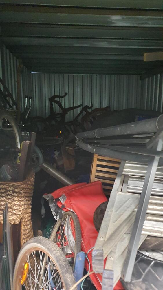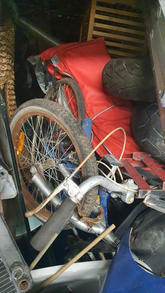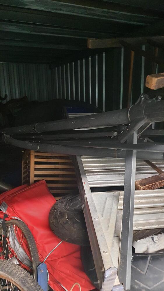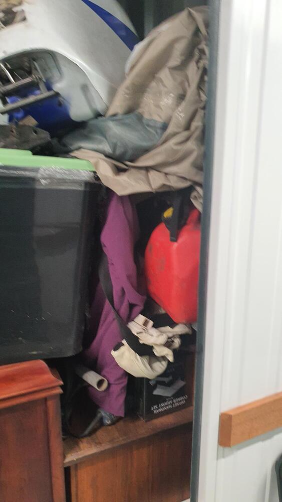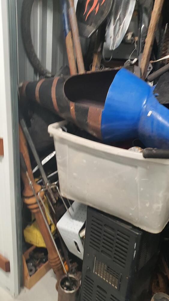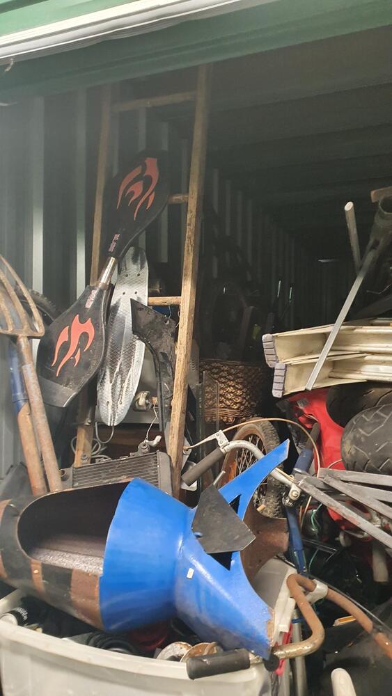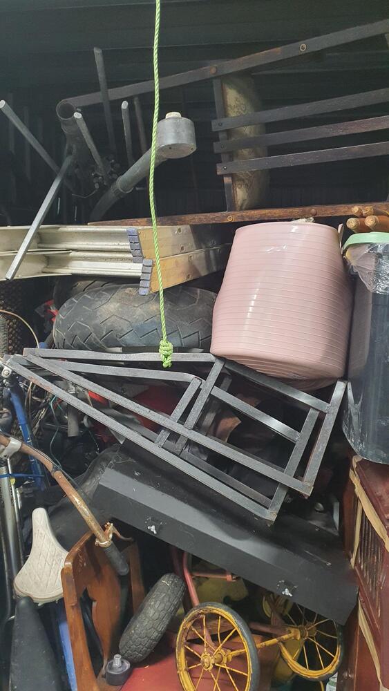 Wooden Draws, Bike and parts, Lots of tools, Wooden Chairs, Wicker Basket, Bike Tyres, Red Tarp, Wooden Rack, Metal Ladder, Wooden Ladder, Skate Board thing, Outdoor fire pit?, Garden Tools, Portable Air Con?, Compressor, Whipper Snipper, Motorcycle Parts, Plastic Tubs full + lots more which I can not see.