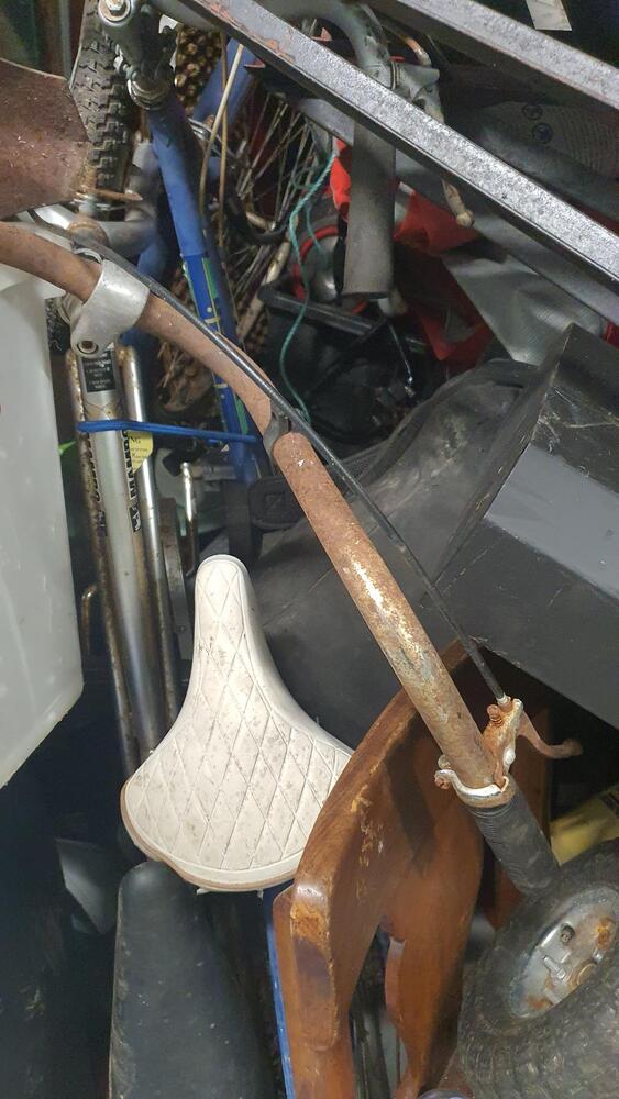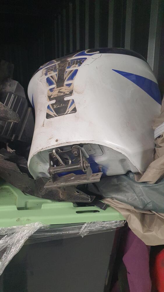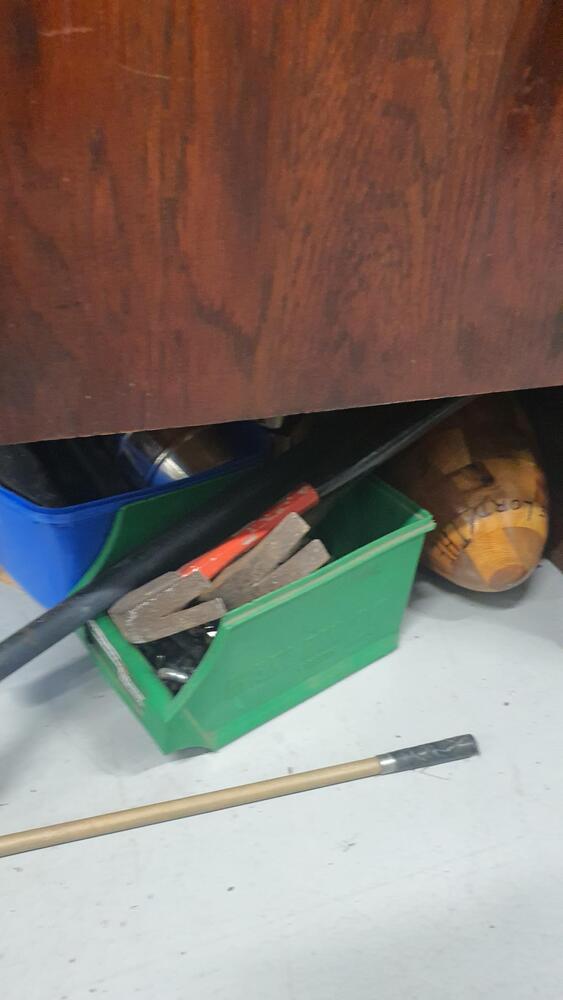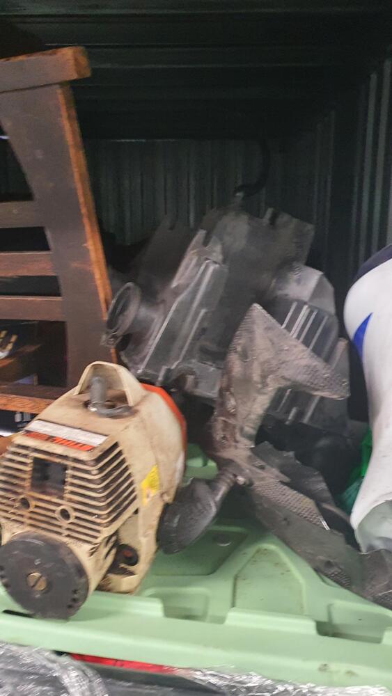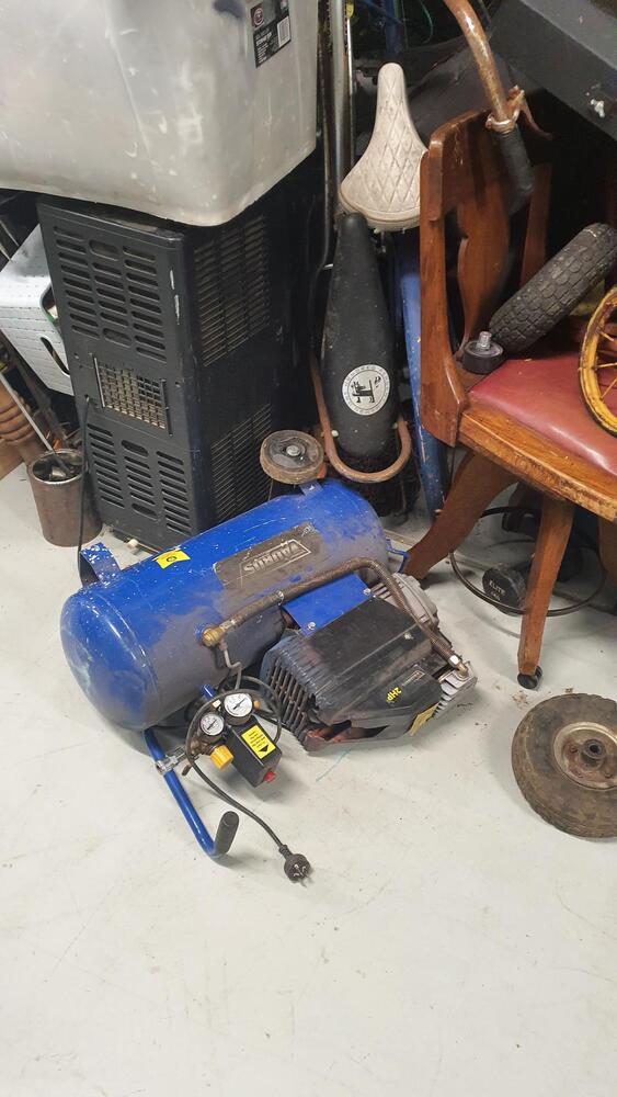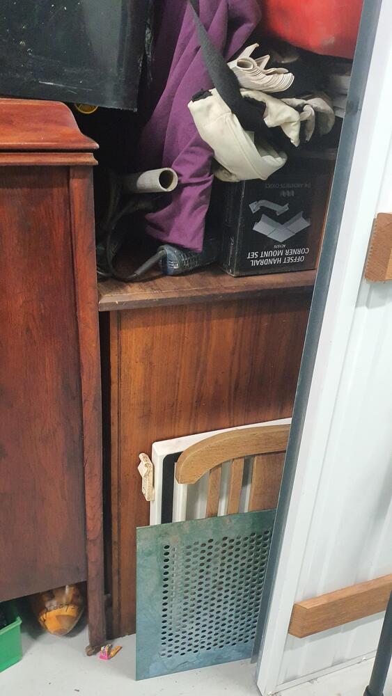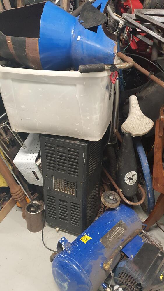 Wooden Draws, Bike and parts, Lots of tools, Wooden Chairs, Wicker Basket, Bike Tyres, Red Tarp, Wooden Rack, Metal Ladder, Wooden Ladder, Skate Board thing, Outdoor fire pit?, Garden Tools, Portable Air Con?, Compressor, Whipper Snipper, Motorcycle Parts, Plastic Tubs full + lots more which I can not see.
