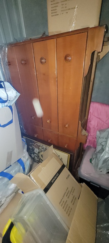 Timber shelf unit, Teddy bear, Lamp shade, Timber bed frame, Coffee table, Dressing table, Trunk, Heater, Assorted bags of clothing, Assorted empty boxes and containers.