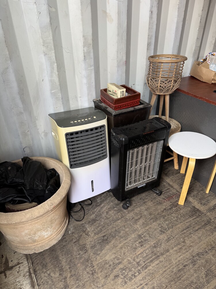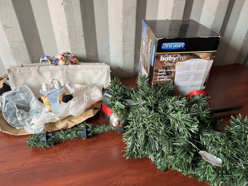 Household and office goods and furniture, including heaters, desks, stools filing cabinet, christmas tree, white cupboard, large desk on wheels, large timber extendable table, red lounge chair, office chairs, baskets, large rug, vehicle windscreens, washing machine, fan large pots for plant, baby goods including portable cot, bassinet, bottle steriliser etc Refer to photos and video