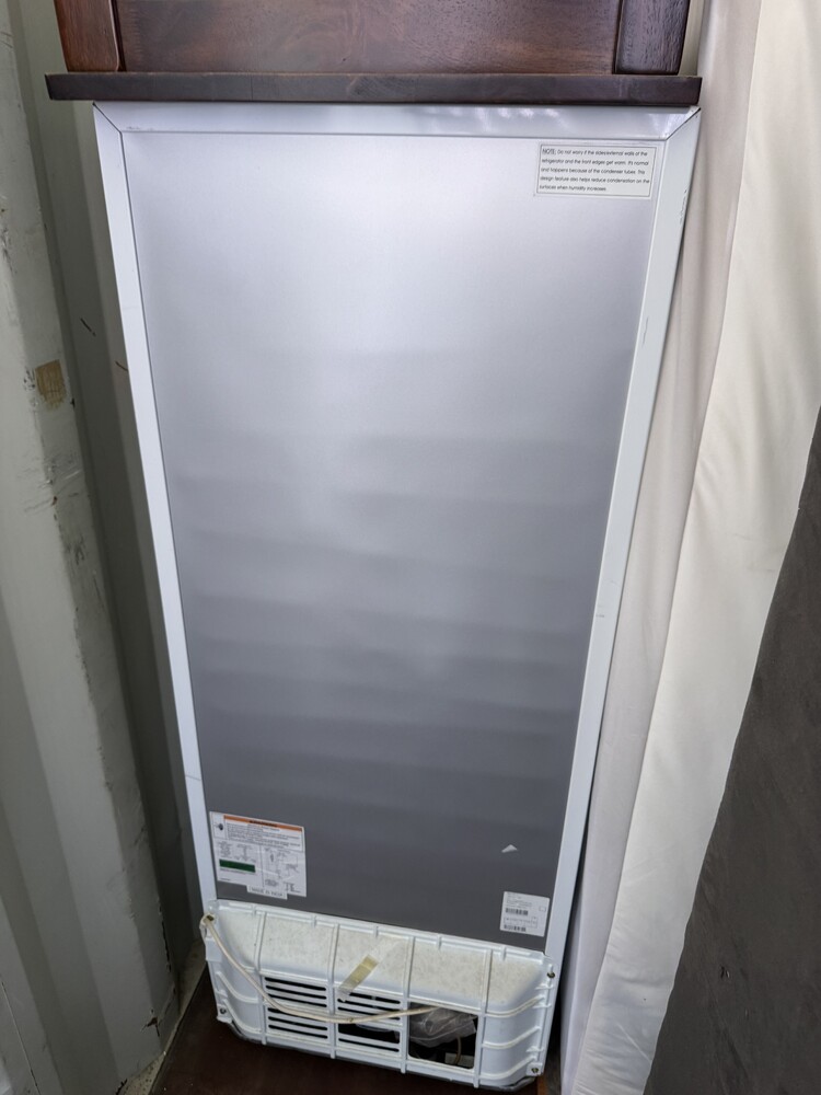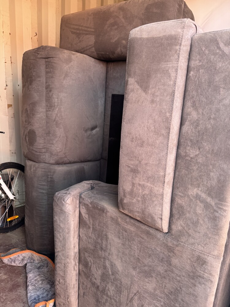 Fridge, couches, corner table/shelving unit, stool, dark wooden small table, mountain bike, bed and frame, rubbish bin, black gloss entertainment unit