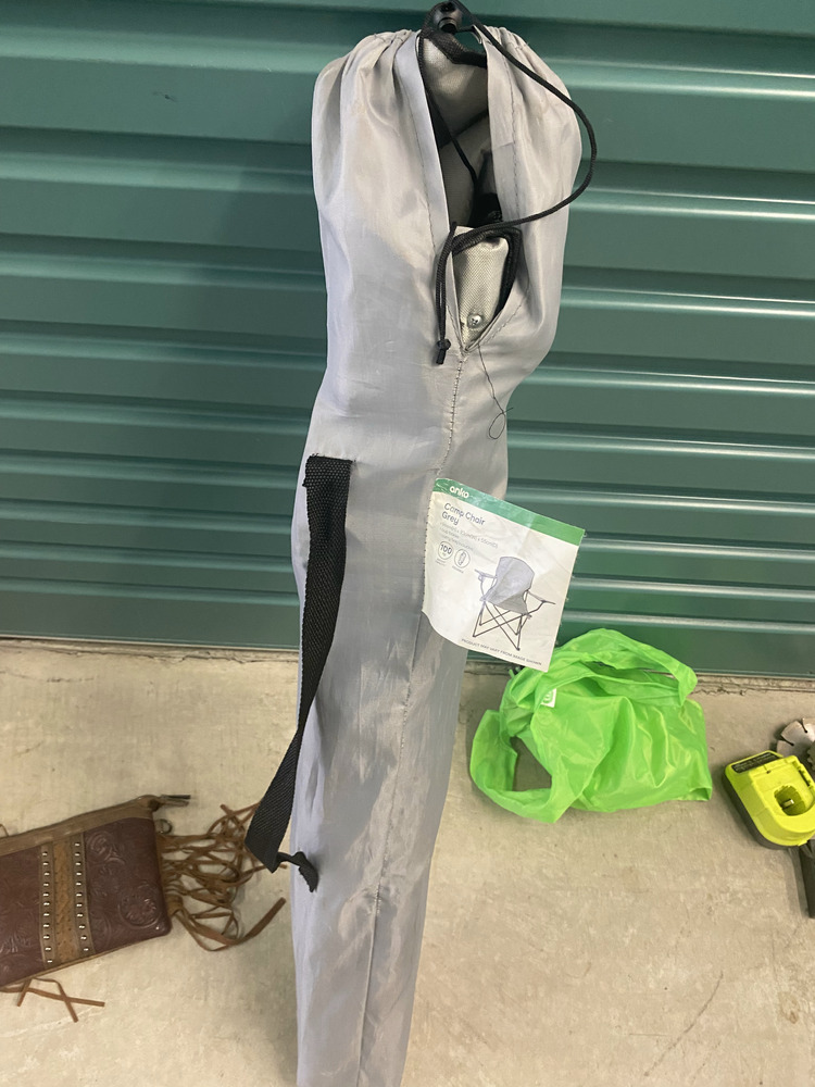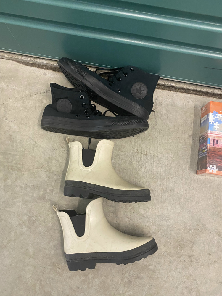 Ryobi Grinder and Charger – Missing Battery, 3 Sealed Jigsaw Puzzles, Ladies Hand bag, Camp Chair, Container of Rubbish, 3 Stuffed Toys, Toiletries Bag, Children Books, Pair of Boots, Pair of Converse Black Shoes, Plastic Container, Towel with storage bag, Loose Clothing, Single Shoe