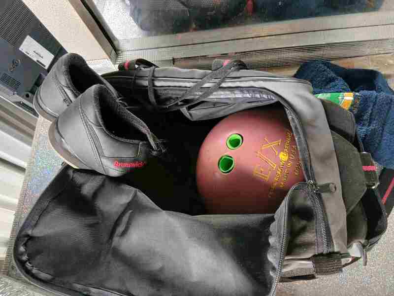 * green bowling ball in a bag with size US 9 1/2 bowling shoes