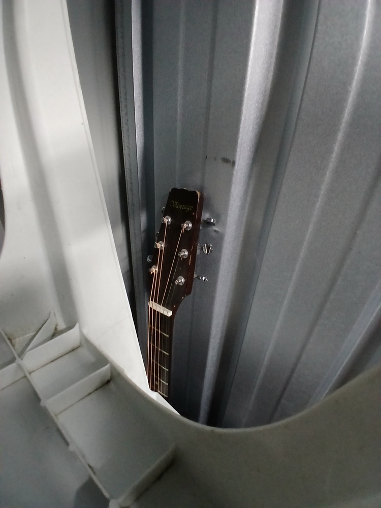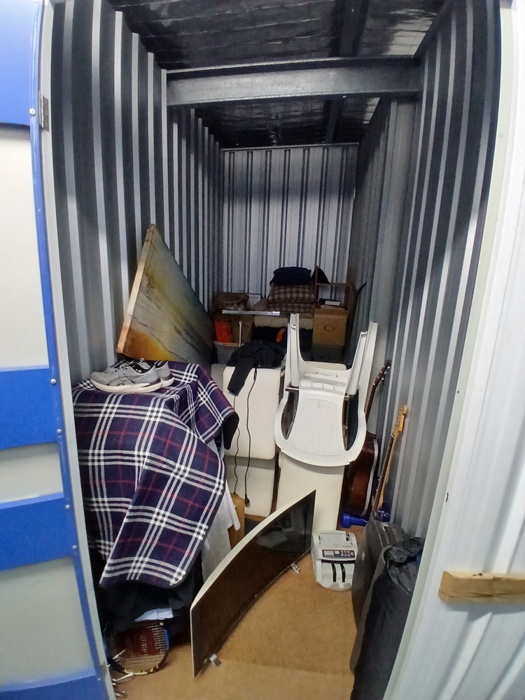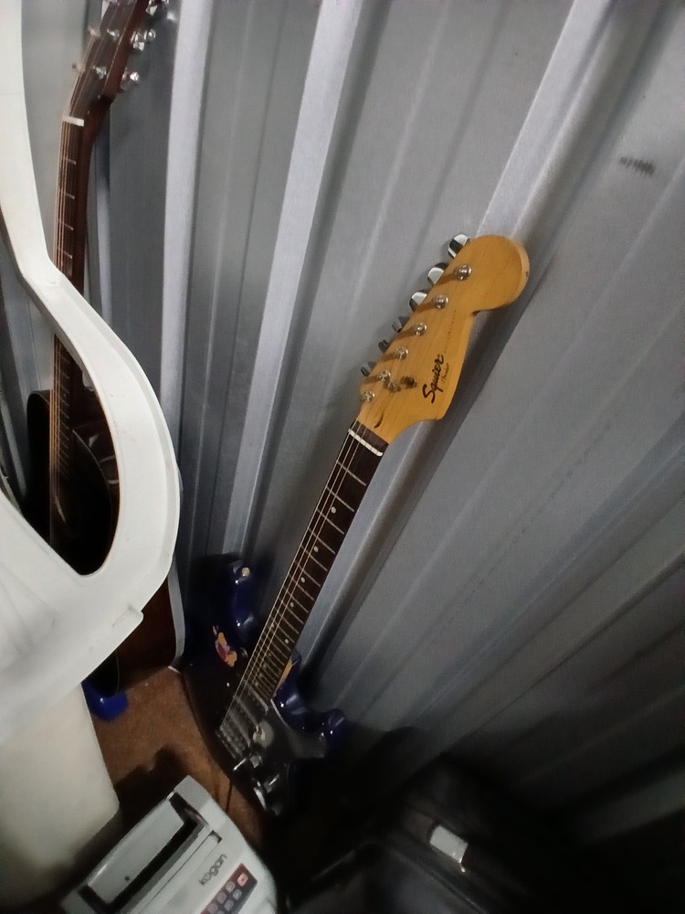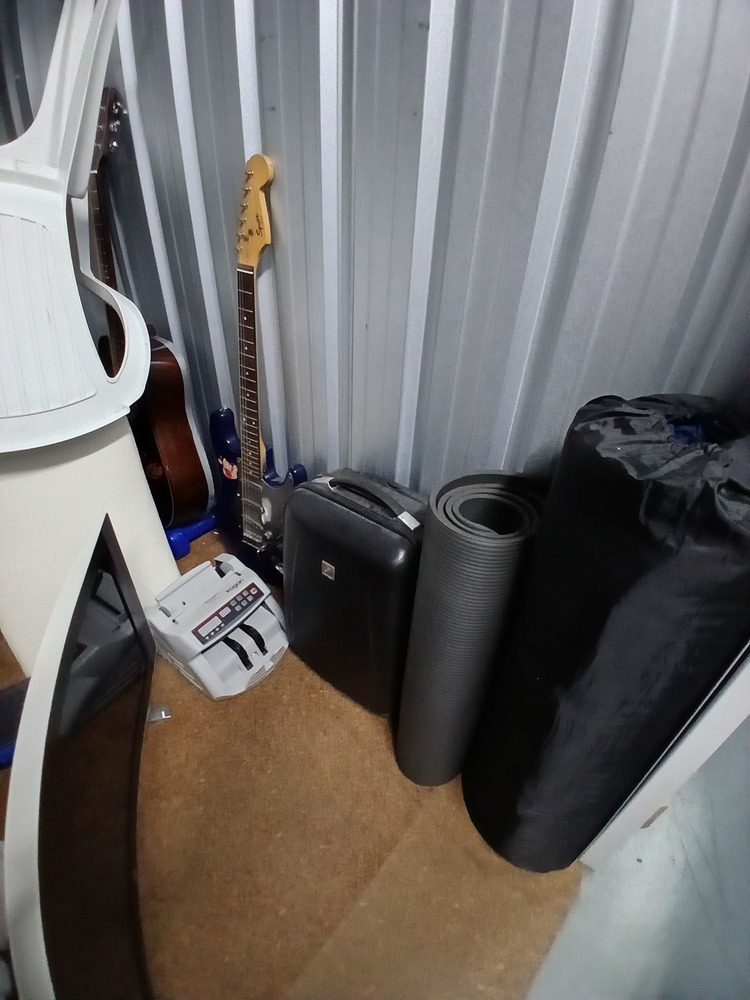 Unit contains Cash Counting machine, Electric Guitar, Amp, Acoustic Guitar, Gaming monitor, golf clubs (no bag seen) Boxes & Plastic storage containers, clothes, chairs and other items as seen.