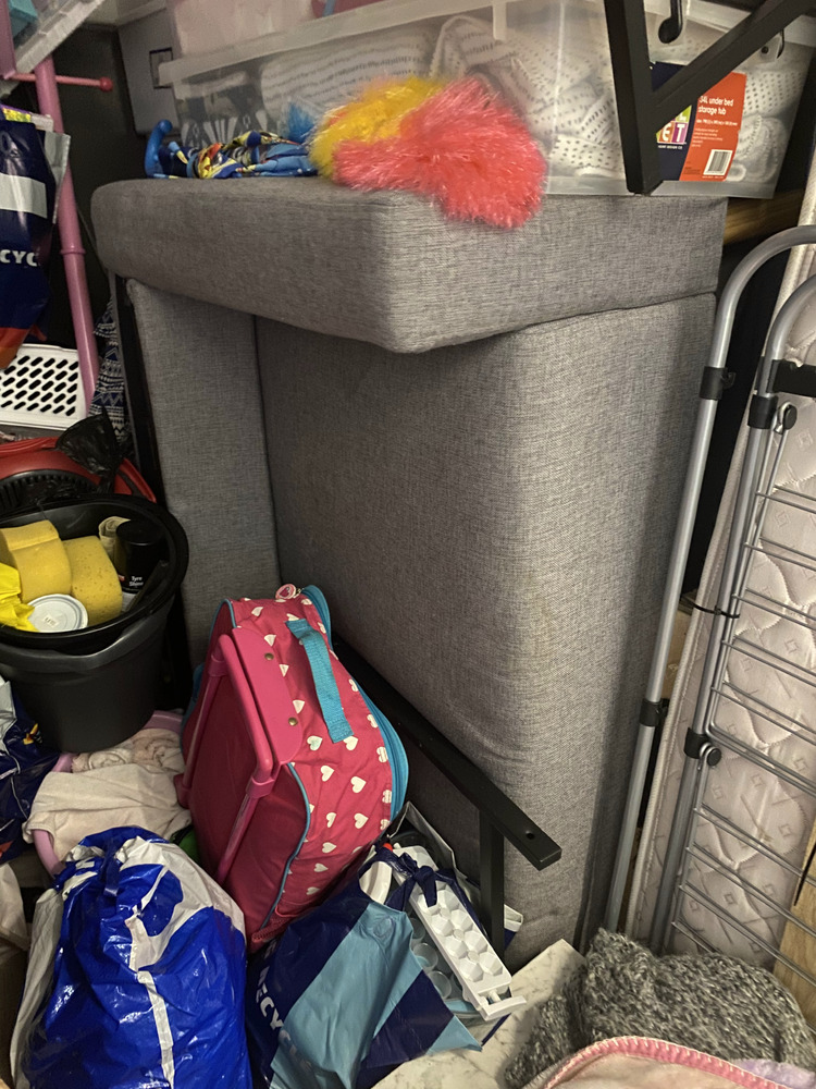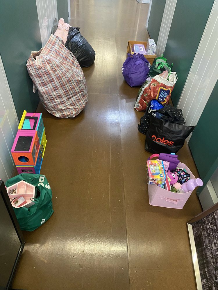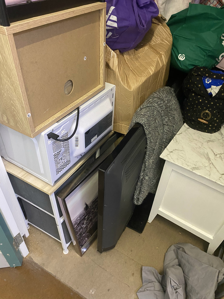 2 Side Tables, Drying Rack, Single Mattress, Lounge, Christmas Decorations, Assorted Childrens Toys, Bin, Assorted Household Items, Storage Unit, Picture, Drink Bottles, Cds, Bags of assorted clothing, Bag of Pillows, Jewellery Box with some pieces, Television, Ipad and case, Small Keyboard, Apple Macbook Air and case, Microwave, Small Suitcase, Small Skateboard, Bag of Linen, Bag of Stuffed toys and coat hangers