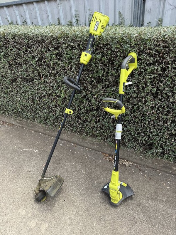 Ryobi battery blower, 2 whipper snippers and battery lawn mower all working with one battery and one charger