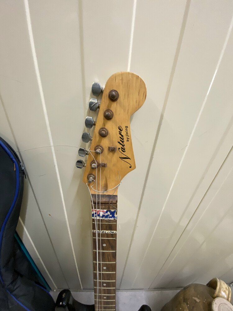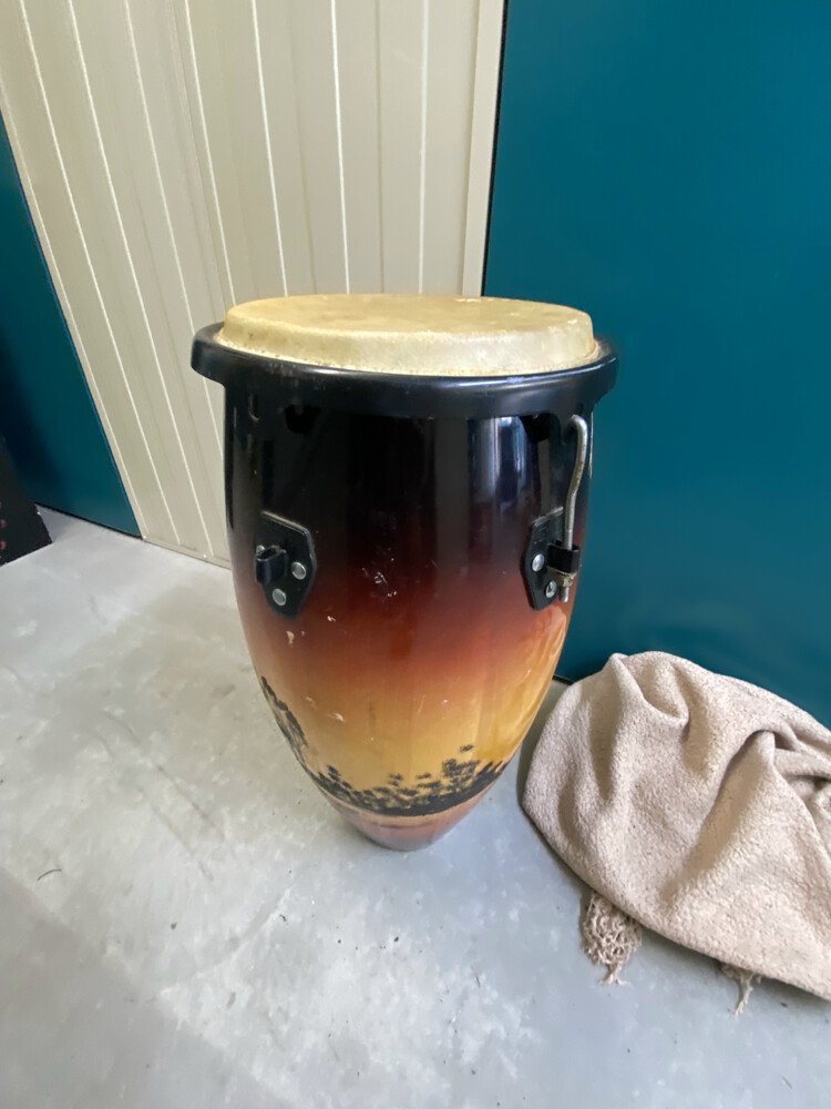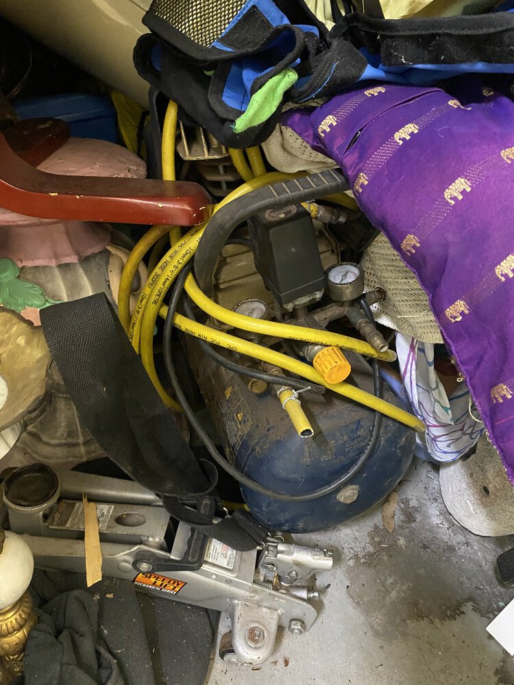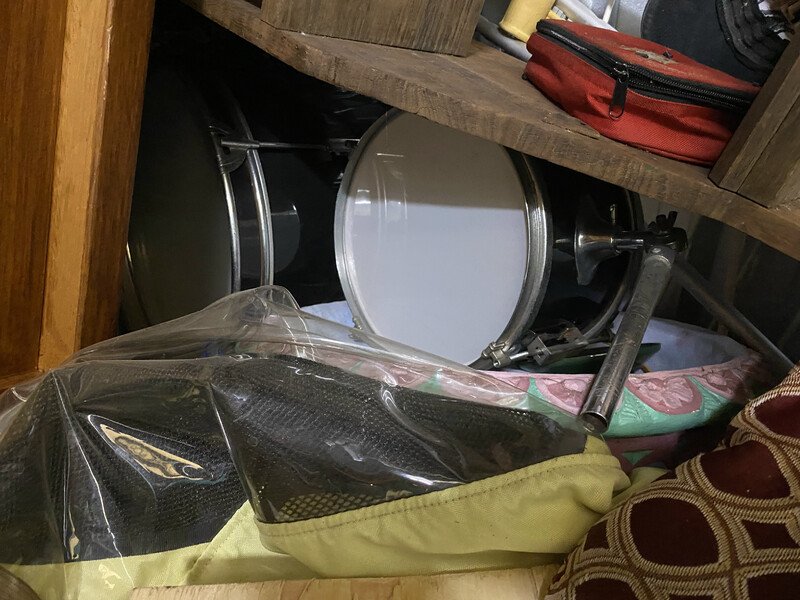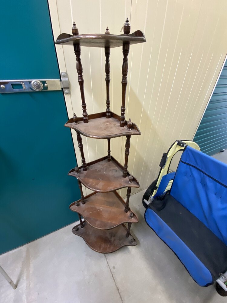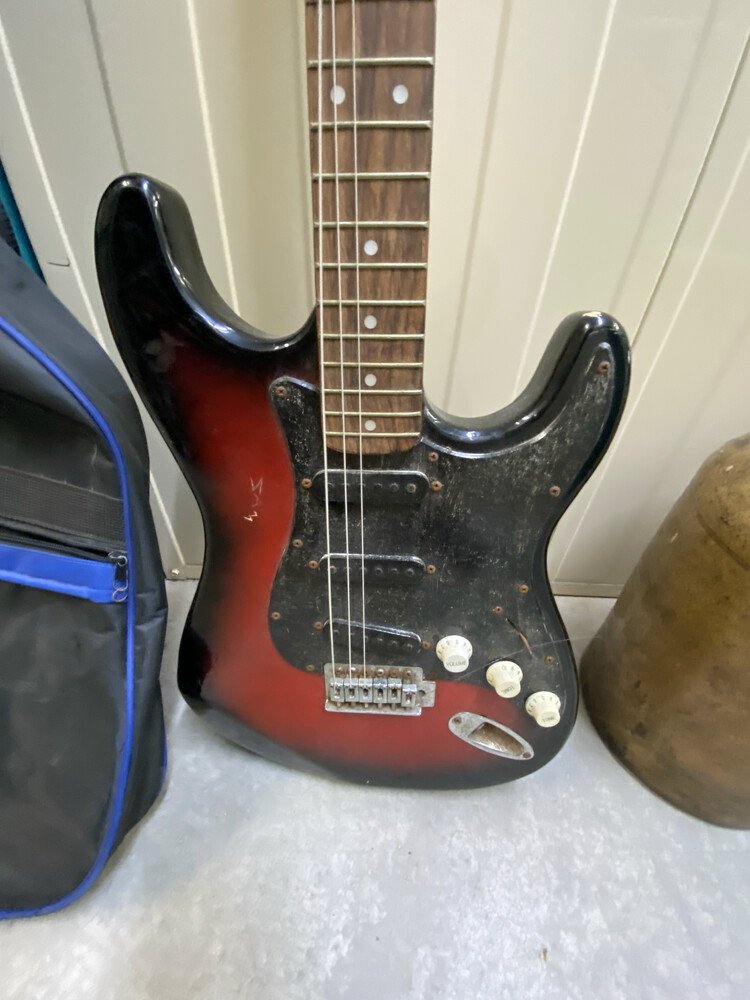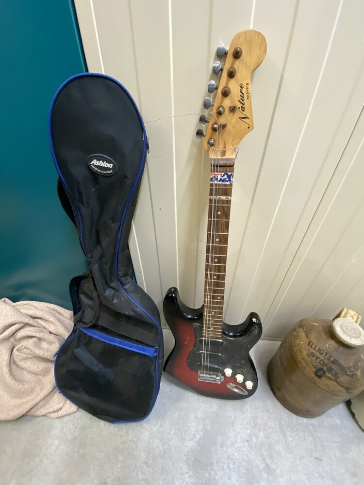 Guitar with case, Assorted Timber Furniture including 4 Dining Chairs / Table, Electric Heater, Boxing Bag, Edger, Fridge, Ladder, Esky, Fishing Rod, Vacuum, Suitcase, Drums, Pillows, Compressor, Trolley Jack, Foot Stool, Shovel, Book Cabinet, Bongo Drum, 2 Old Flasks, Fishing Net, Timber Corner Display Unit, 2 Children Bake Carrier, Boxes of Assorted Items, Lamp Base