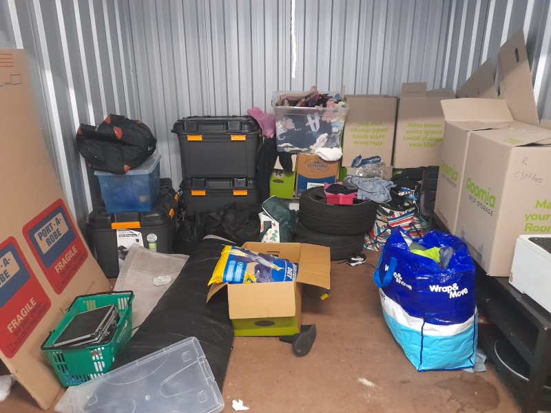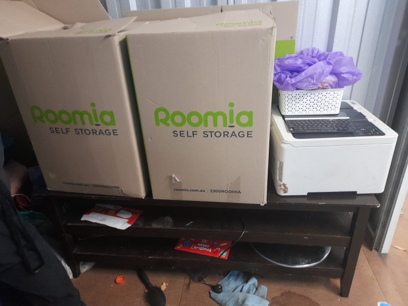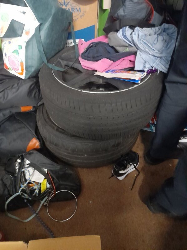 Printer, 2x Tyres +rims, sleeping bag, air mattress, bags of clothes, bird food and unopened boxes
