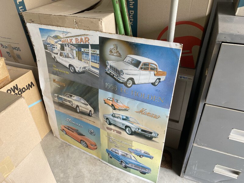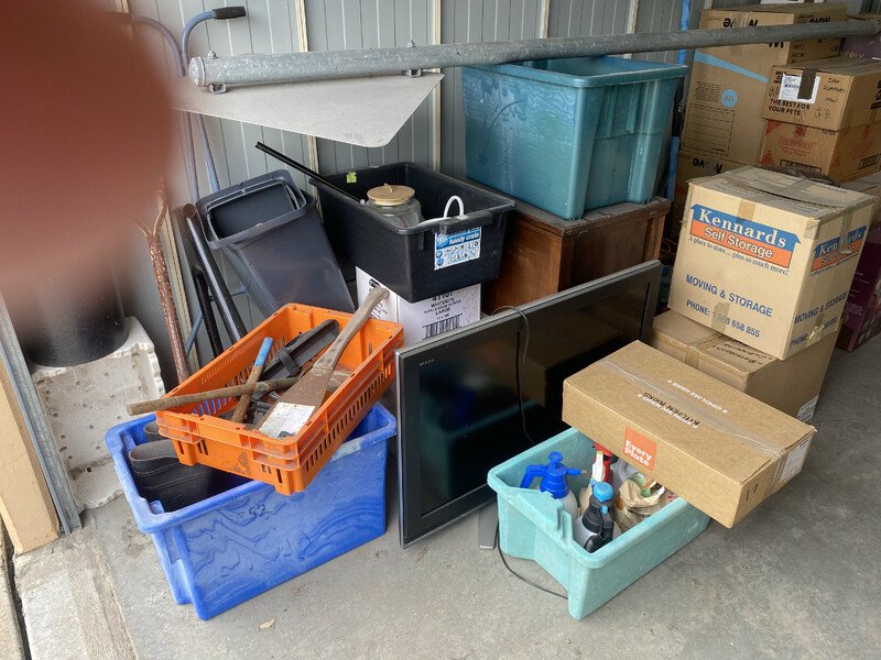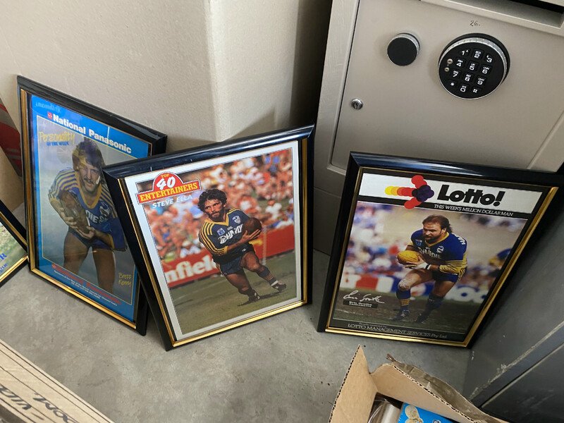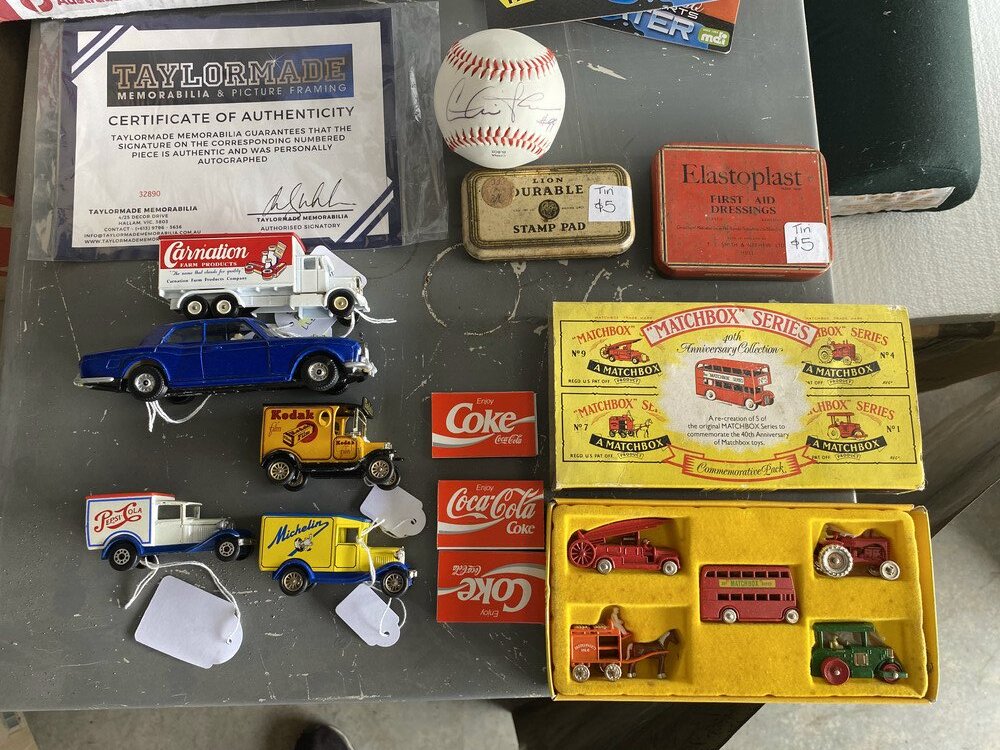 Matchbox Series, 3 Packets of Coke Matches, Old Elastoplast First Aid, Stamp Pad, Signed Base Ball, The Man From Snowy River Poem Book, Mad Container, 5 Model Cars, 2 Water Pistol Guns, Drying rack, Timber, Street Sign, 4 Pairs of Shoes, Shovel x 2, Hole digger, Metal Car Sign, Stuffed Toys, Box of Assorted Ornaments, Phantom Magazine, Filing Cabinet, Safe, Box of Assorted opened Cans, Box of Books, 4 League Pictures in Frames, Get Smart Figurine in box, AC/DC Beer Can unopened, Box of Assort items including Cricket Statues, Box of Kitchenware, Foot Massage Unit, Box of Linen, AC/DC Bar Stool, Boxes of assorted household items, Power Lead, Walking Stick, Crutches, Assorted Glass Bottles, Timber Cabinet, Street Intersection Sign, Television, Push Motorless Mower, Box with Assorted Painting items, Box with Paperwork / Books, Gum Boots, Part of Bike Frame, Bucket