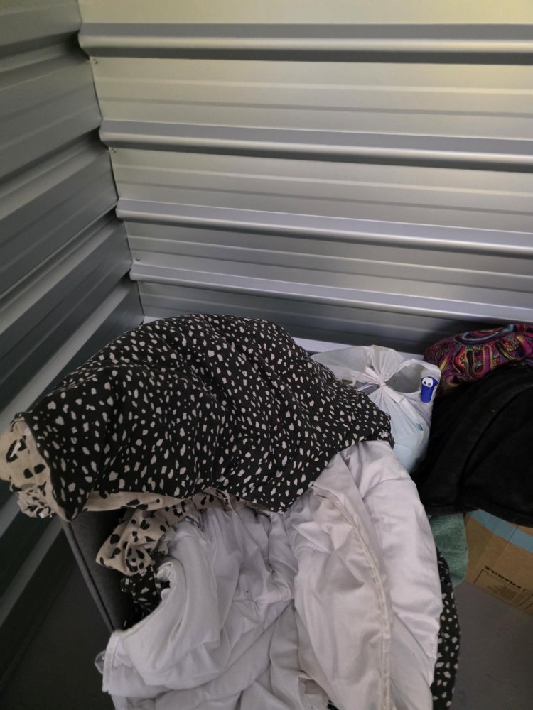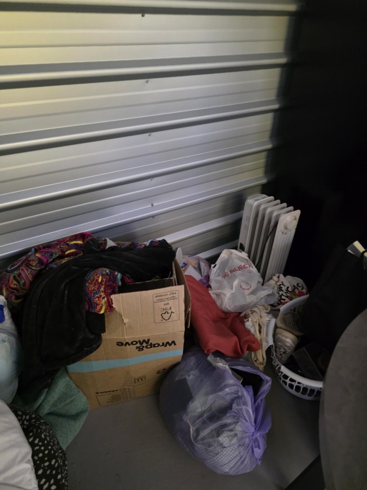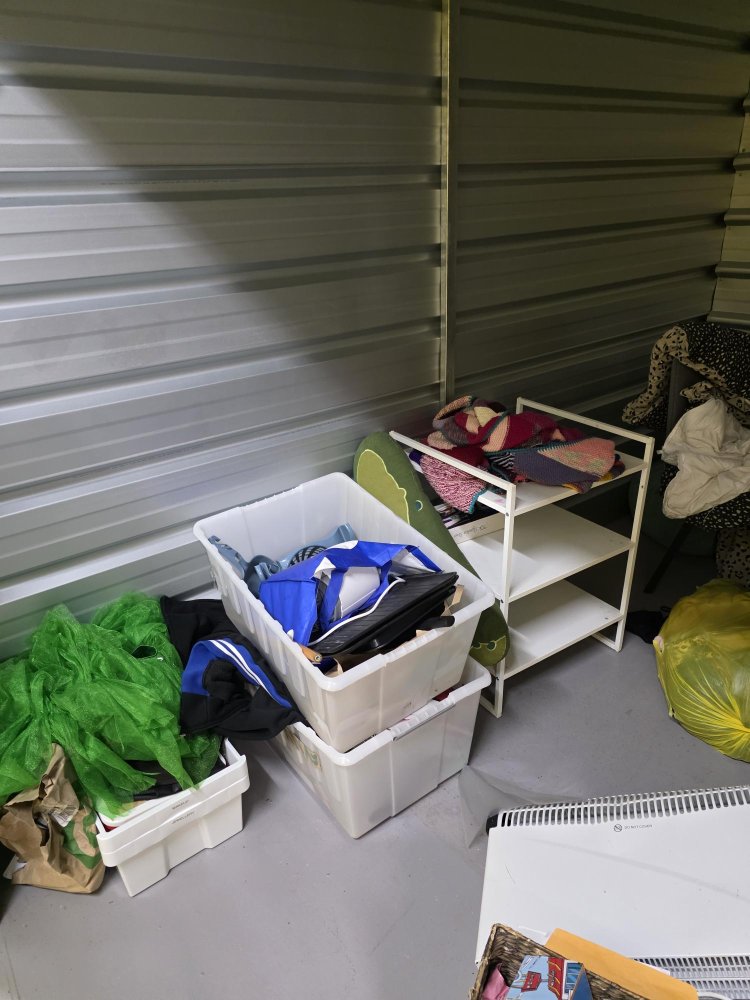 From what we can see inside this unit we have household furniture, clothes, bags and boxes We could not see all the way in