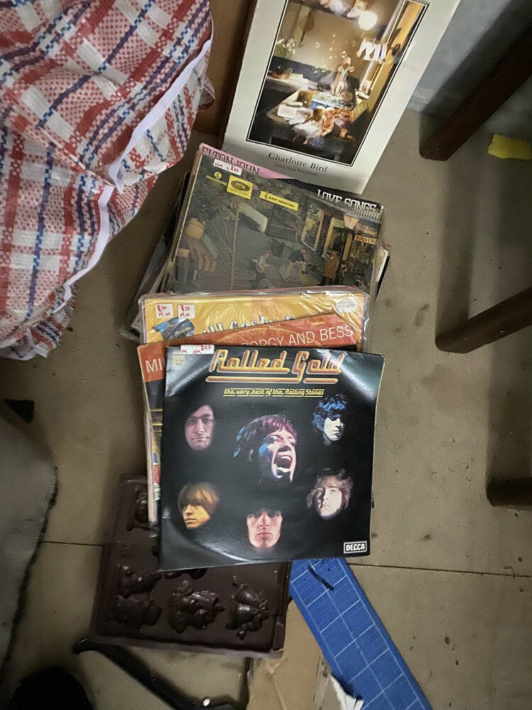 Assorted LP Records, 3 Handbags, Timber Table, 4 Dining Chairs, Stuffed Toy, Large Mirror, Rug, Television, Container with Christmas Decorations, Laptop Bag, Self Adhesive Tabs, Servicing Dish, Cutlery Tray, Jigsaw, Poles, Riding Helmet