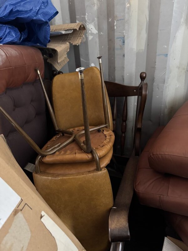 Household goods and furniture, including retro chairs, table, couch, bed frame, single mattress, tools, large esky, crockery, iron, lampshades, ropes, linen, vacuum cleaner, fan, fax machine etc