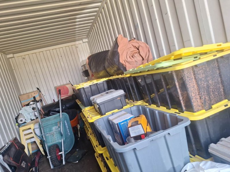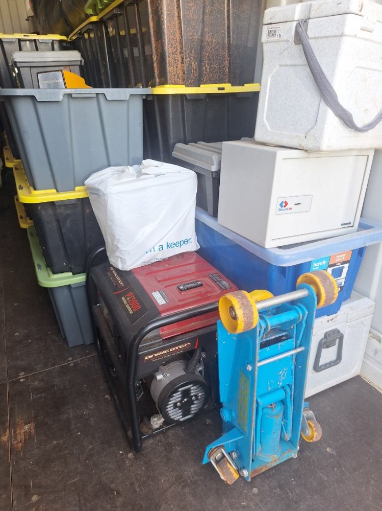 From what we can see there is various camping equipment, 2 x swags, folding outdoor table. A Generator, wheelbarrow and mixed plastic containers with unknown items.
