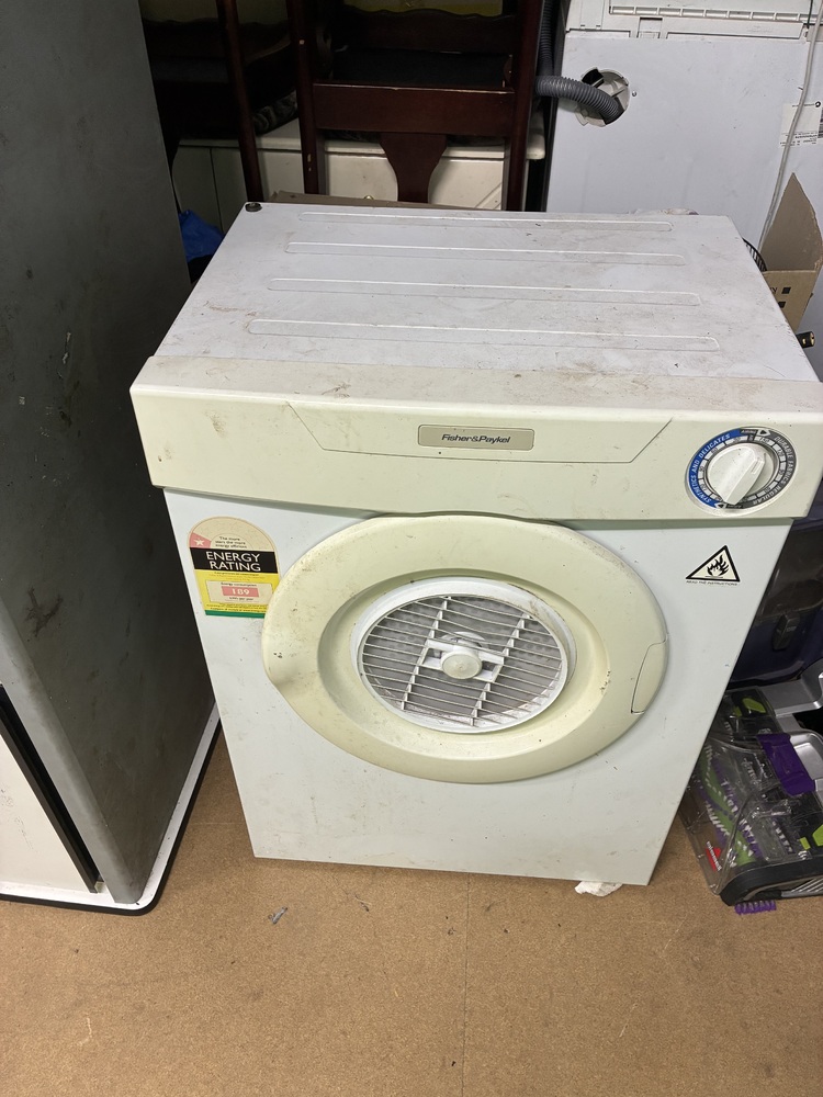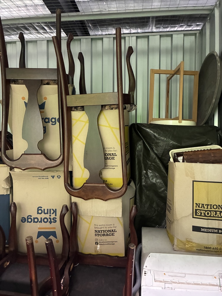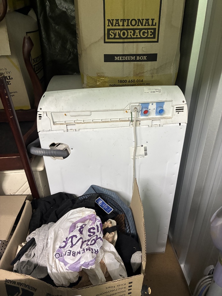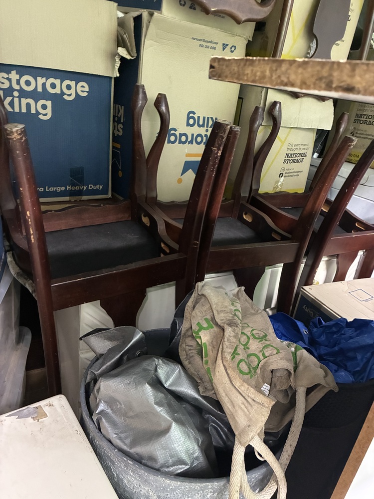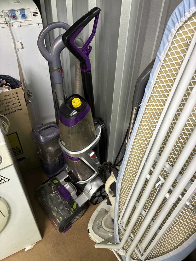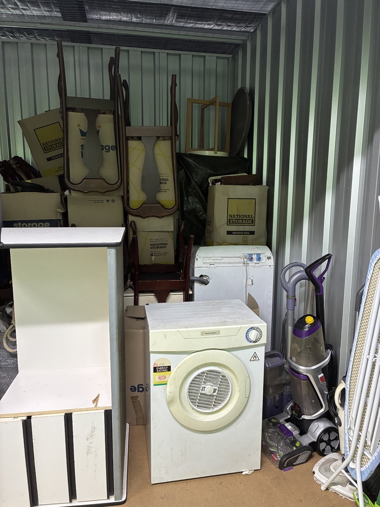 Boxes, bags, chairs, vacuums, ironing board, white goods, containers, display cabinet, desk.