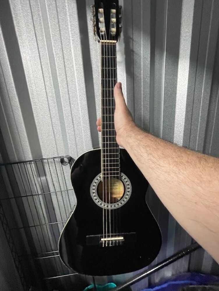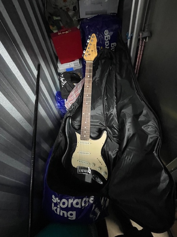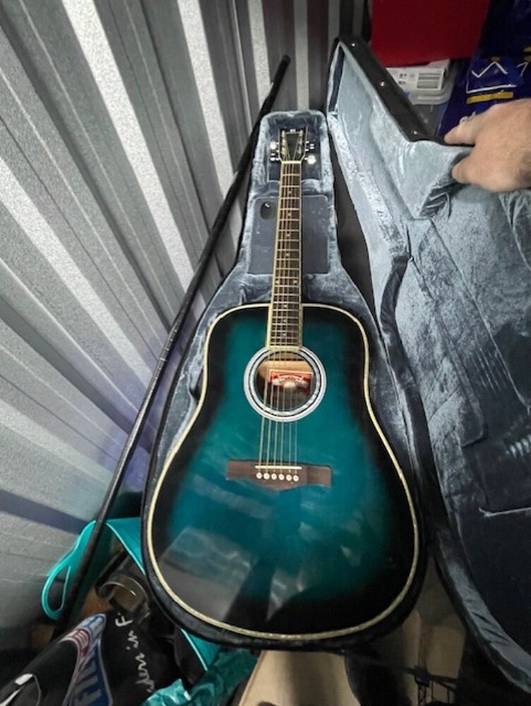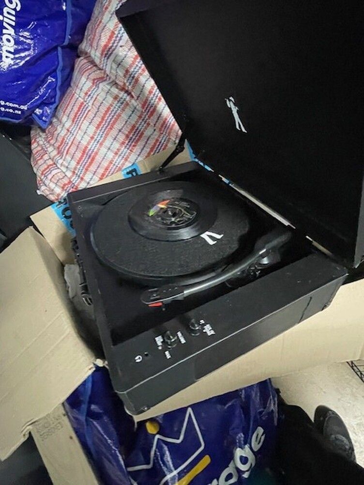 1 x wooden chest, 1 x Samsung Side by side Fridge Freezer, 1 x record player, 1 x electric guitar, 2 x acoustic guitars, 1 x box of crafting stuff, 1 x box with red glass shisha pipe, 10 x bags and boxes of house hold goods.