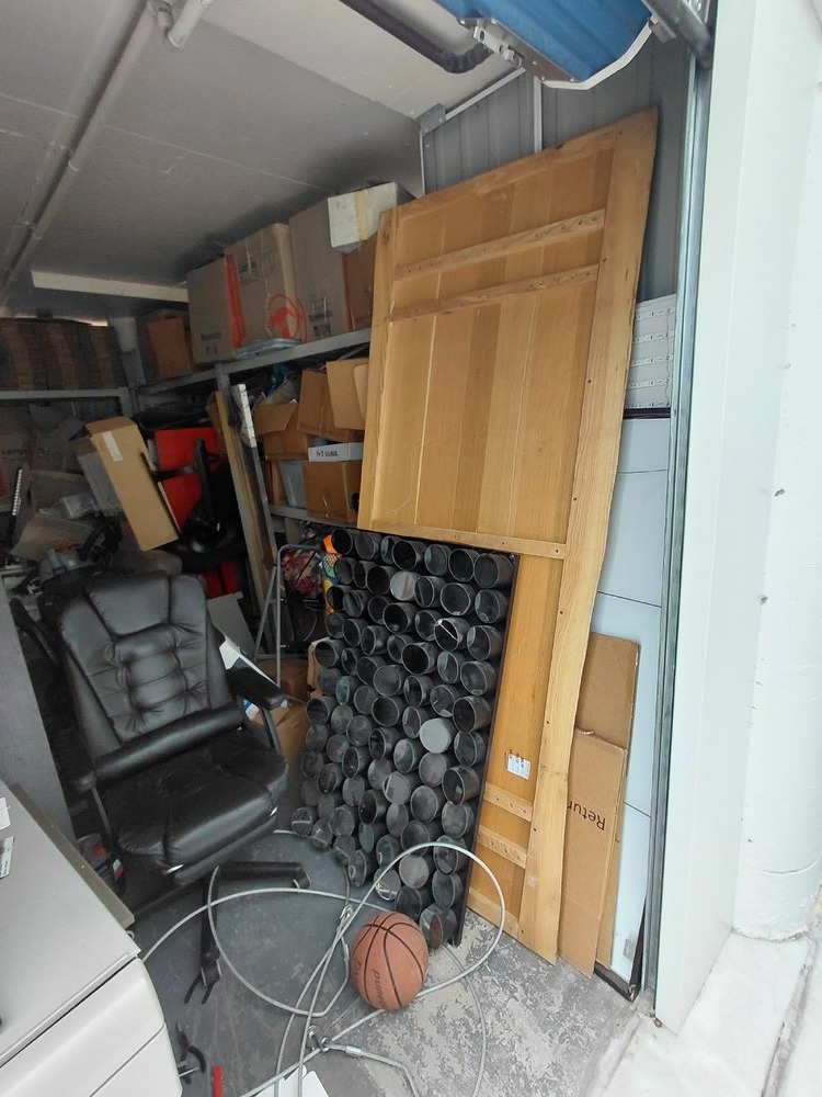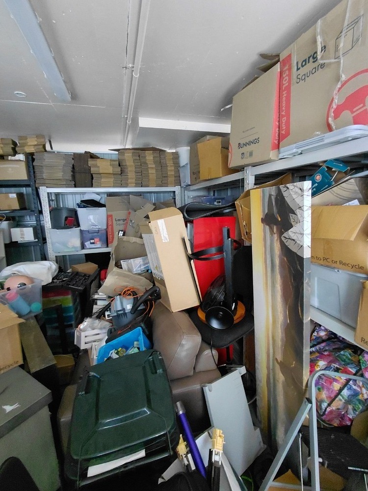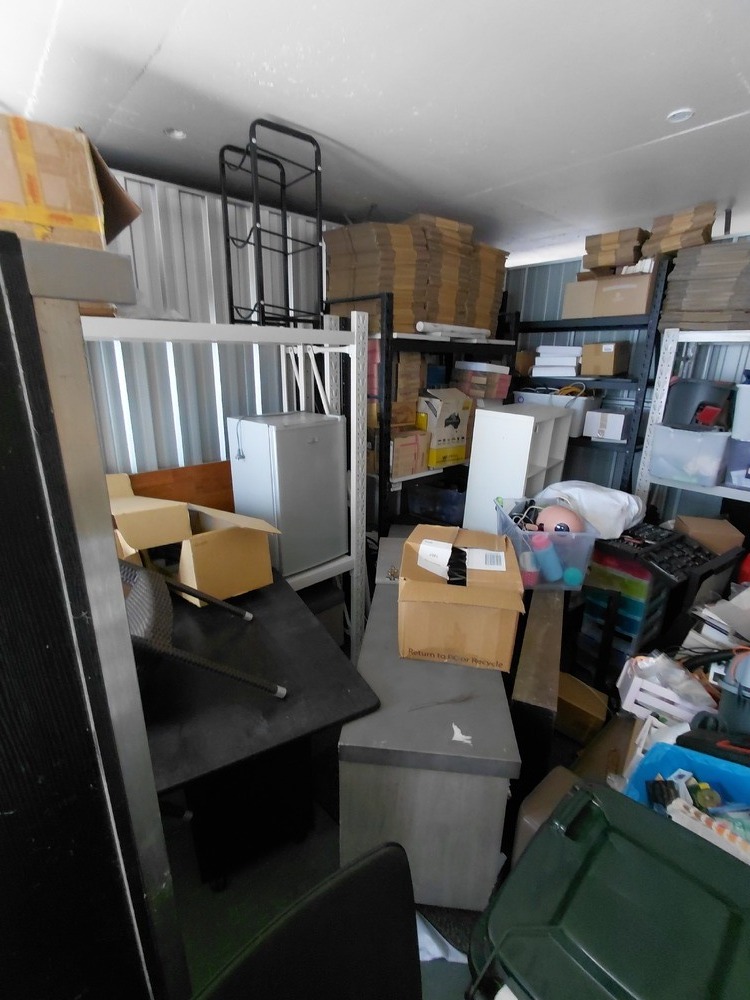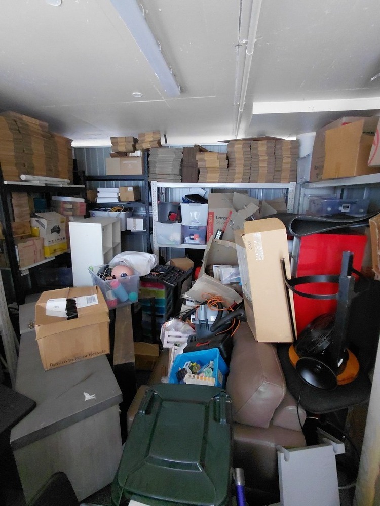 Large unit with 2 commercial printers, a commercial laminator, Electric drill, couch, bar fridge, unused toners and cartridges, unused boxes, shelving, thick rubber mats, toolbox with tools and hardware inside, multiple ladders, buffet/sideboard, all-in-one iMac, dyson attachments, vacuum, desk fan, portable aircon, unused blank card, misc. boxes.