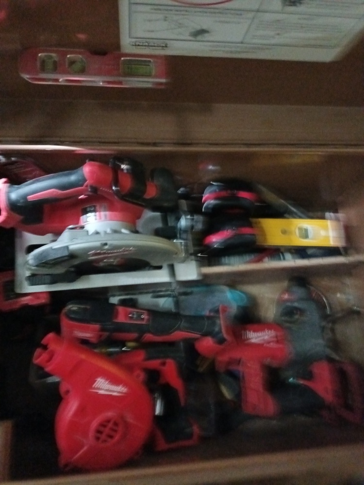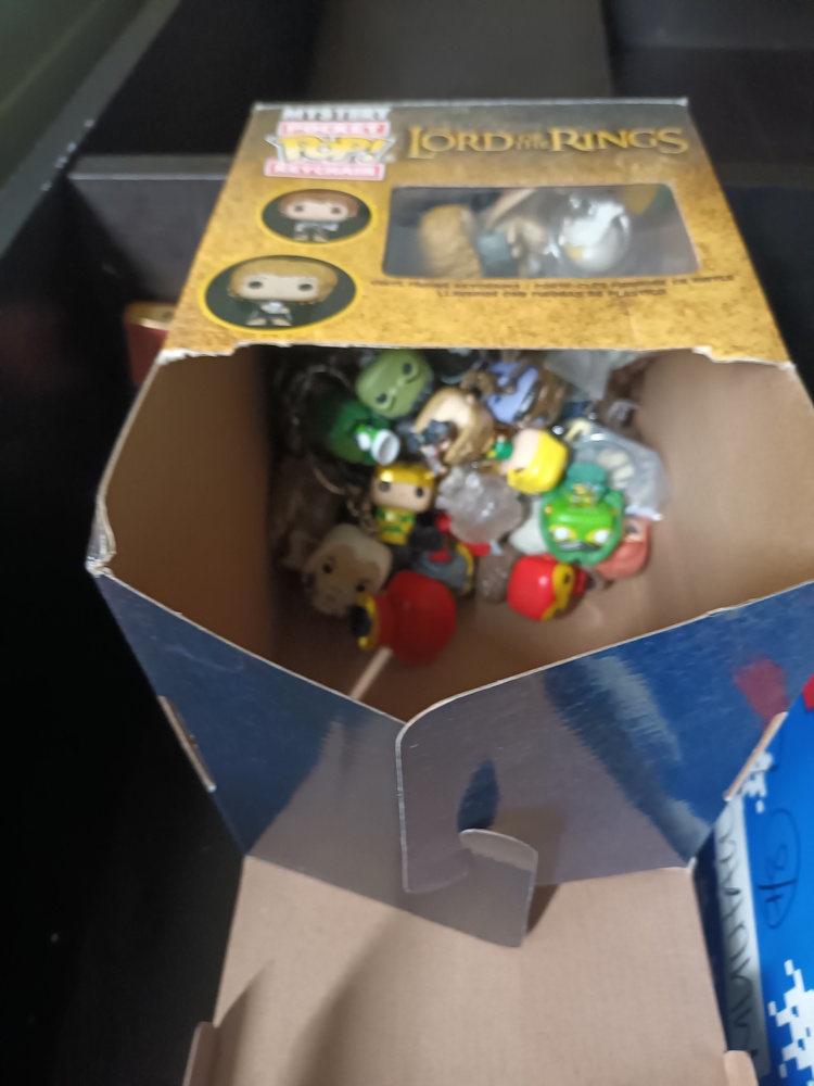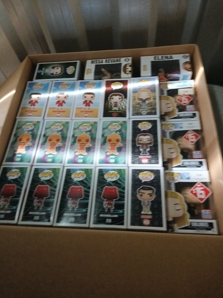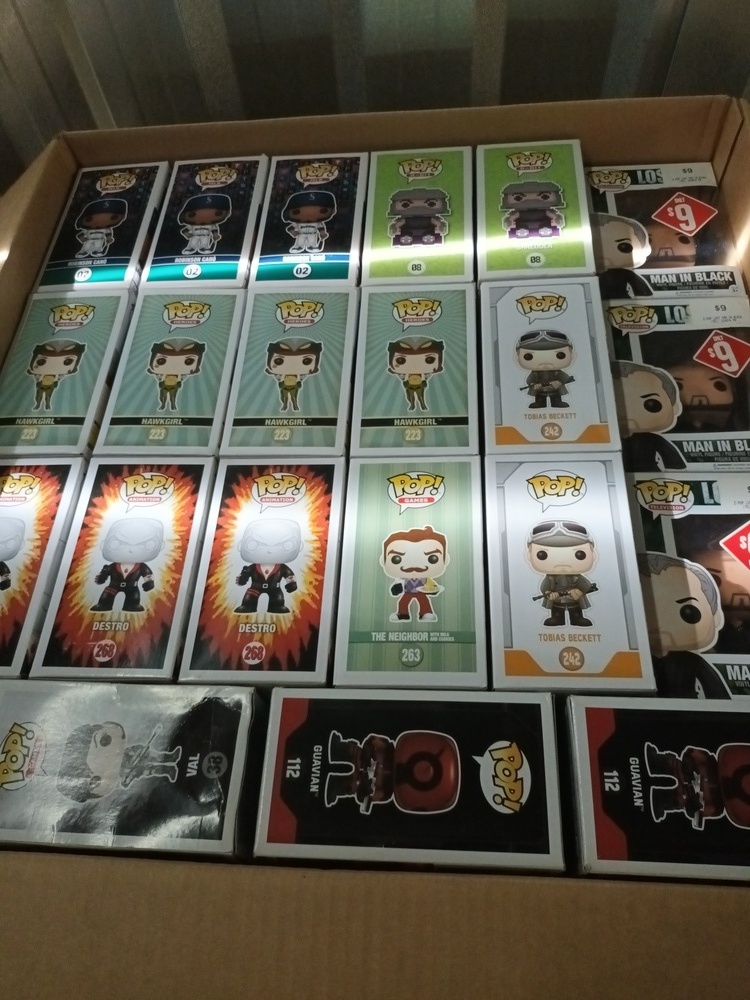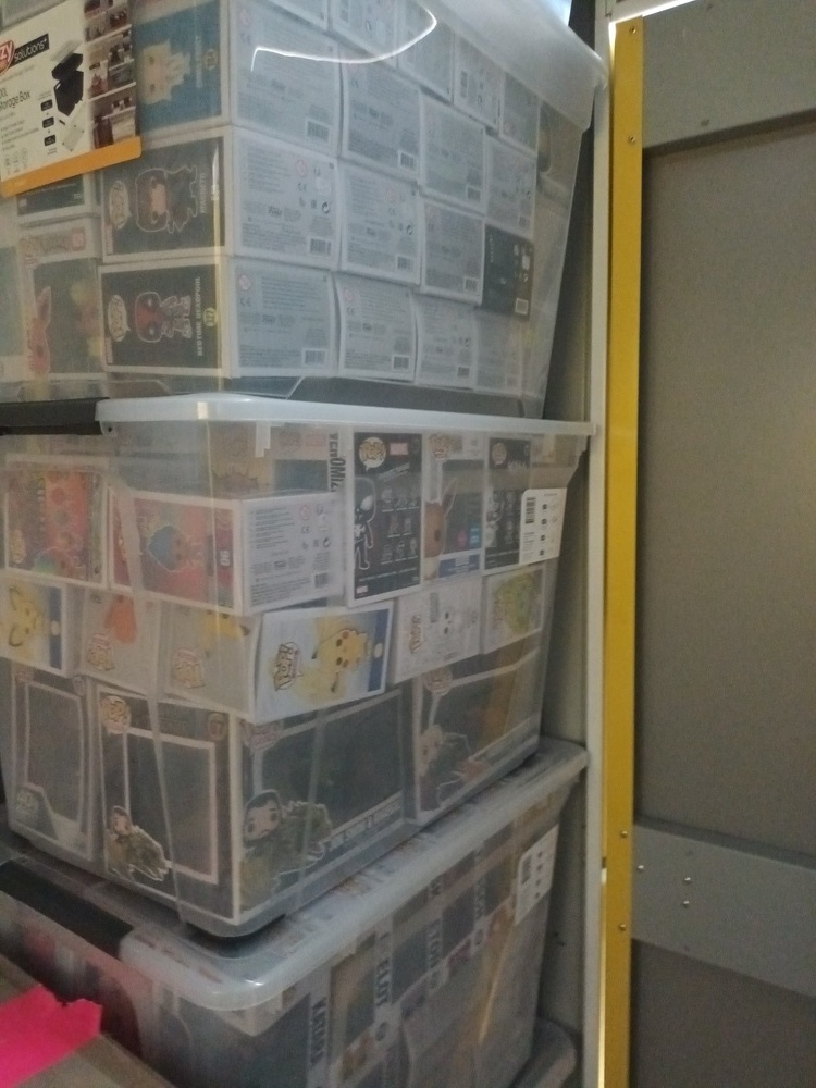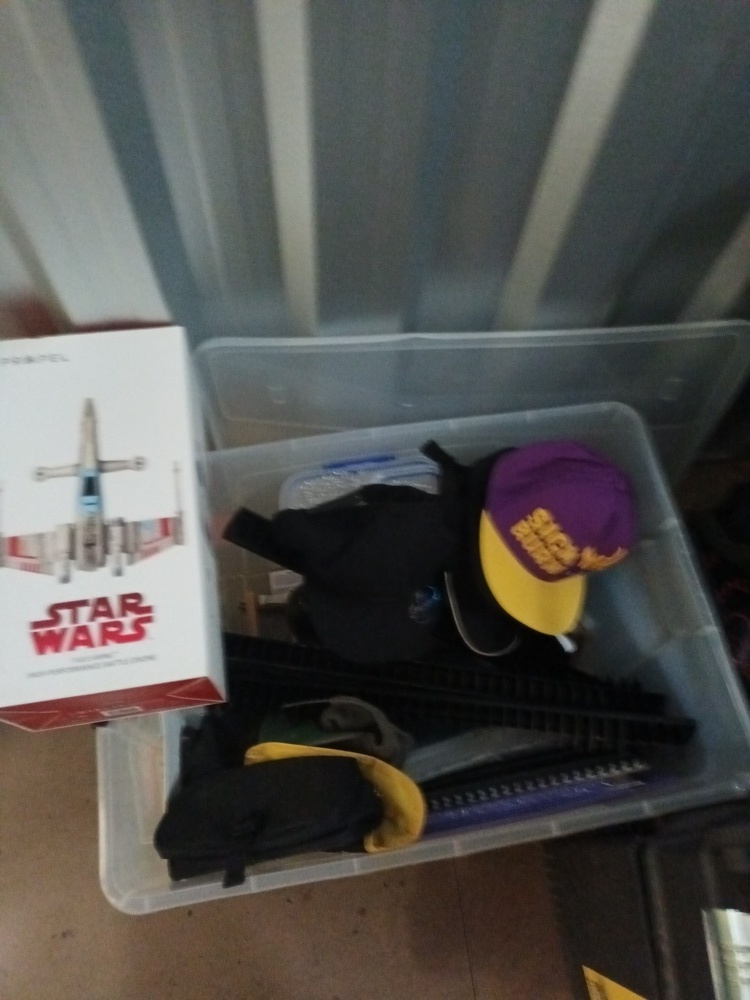 Lots of boxes of pop vinyl figurines, video game gun replica (Gears of War), gel blaster rifle & accessories, Star Wars battle drone, double camping chair, PS4 games, CD's, DVD's, boxes of books, Stanley toolbox, Milwaukee tools, blower & other tools, bed frame & black bookshelf.