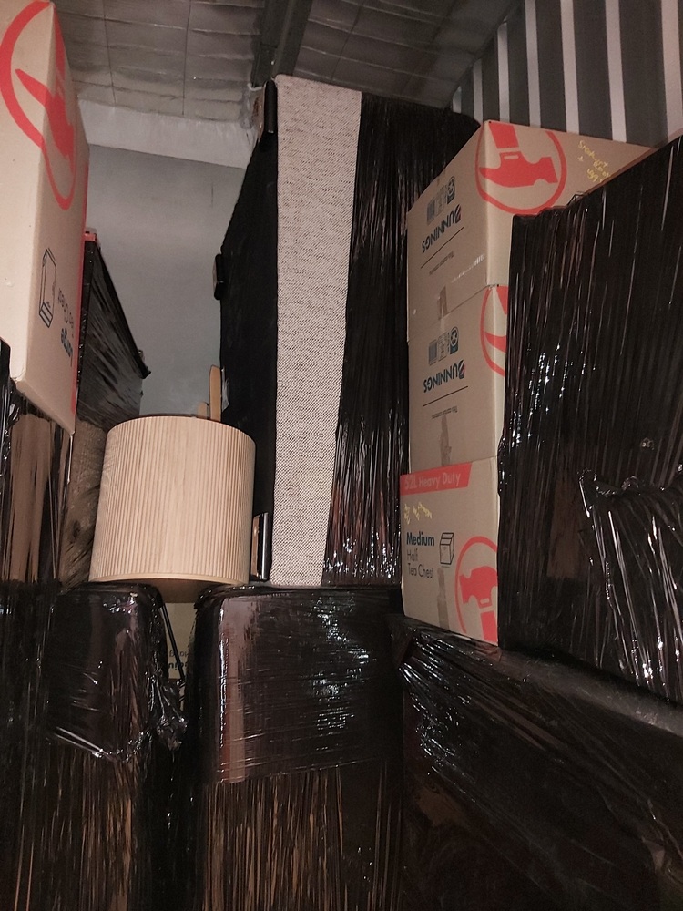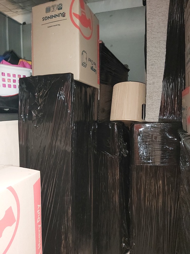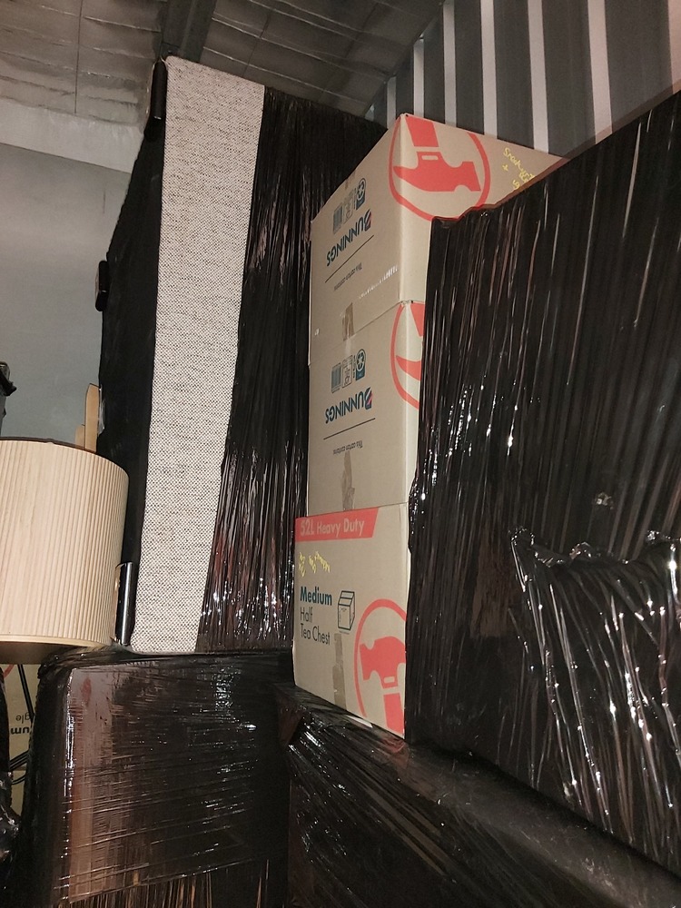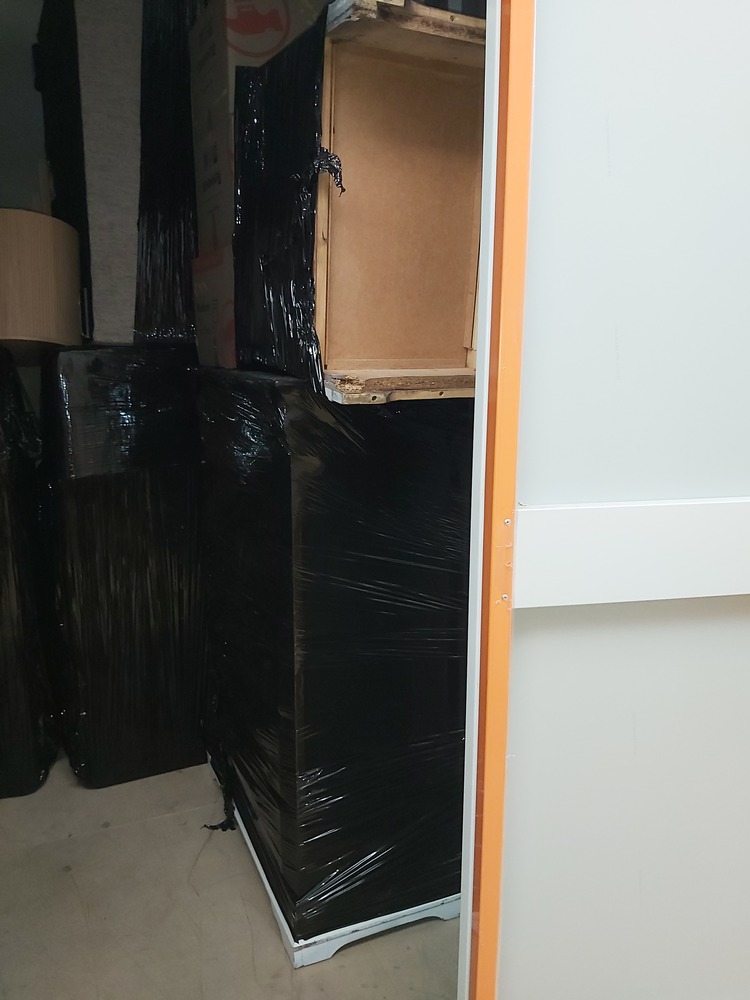 Furniture items - plastic wrapped - Sofa, cabinets, bed base visible