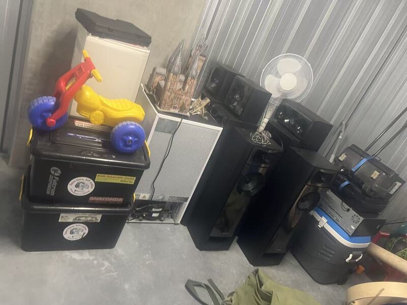 Small Fridge, boxes, kids toys, musical stuff, movie equipment fan, basketball, fishing stuff,