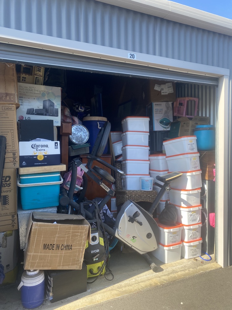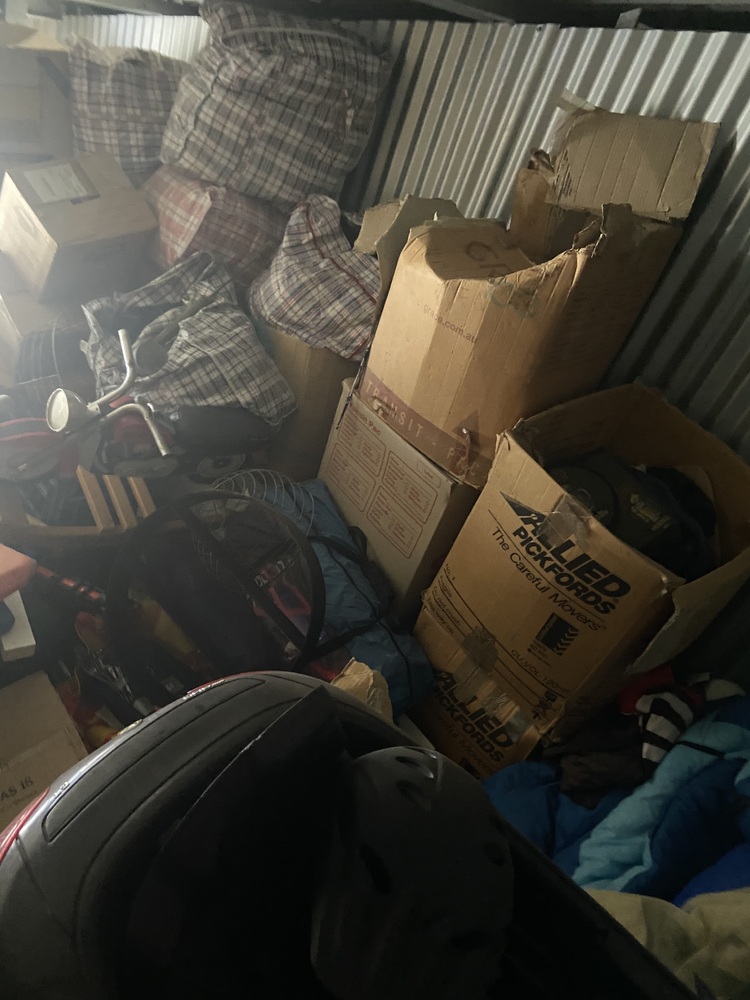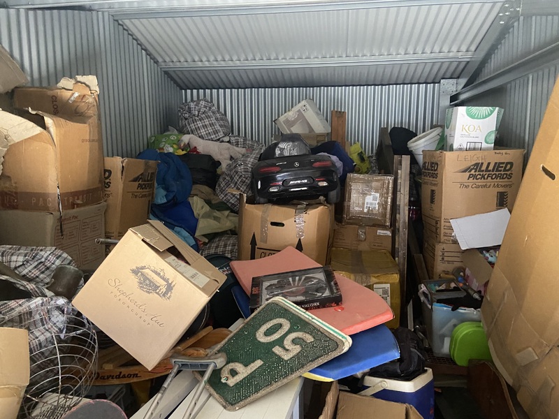 From what we can see it’s got furniture, camping gear, kids items, seems to be a full house worth of things. Truely unable to get into it to properly see.