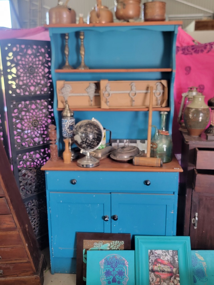 30. Sky blue crockery sideboard, globe and copper pots on top.