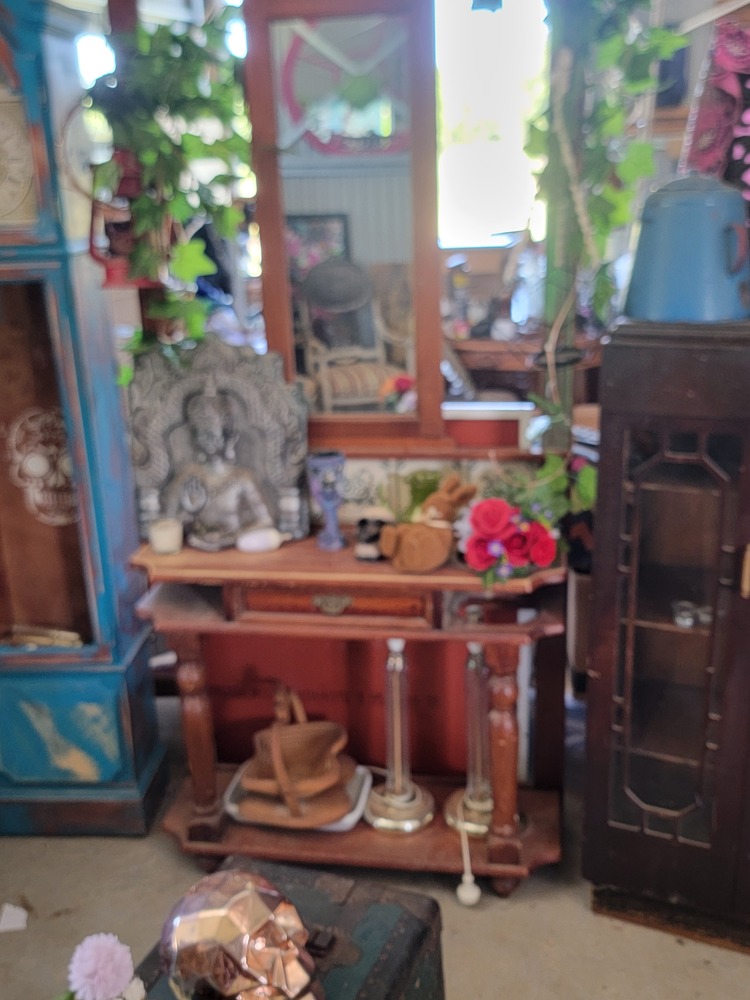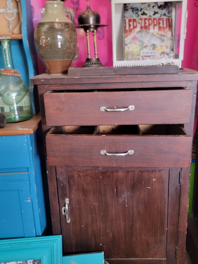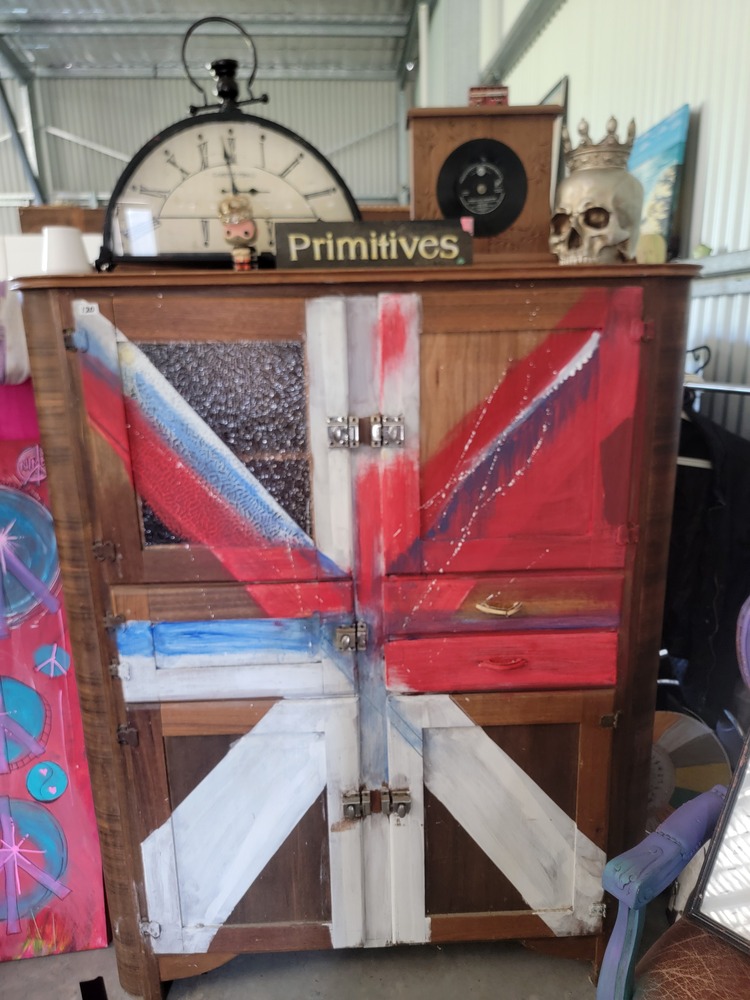 1. Timber cabinet with Mushroom art on top.