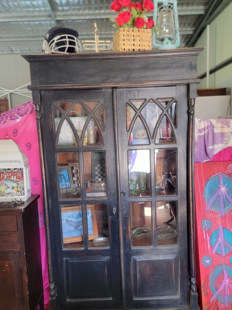 28. Tall black cabinet with glass bowls, miscellaneous ornaments, red roses.