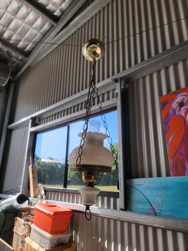 64. Cricket bat, lamp shade, orange plastic box.