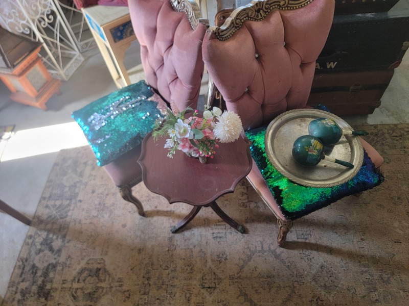 20. French ladies chairs x2 with antique table, maracas and ornaments.
