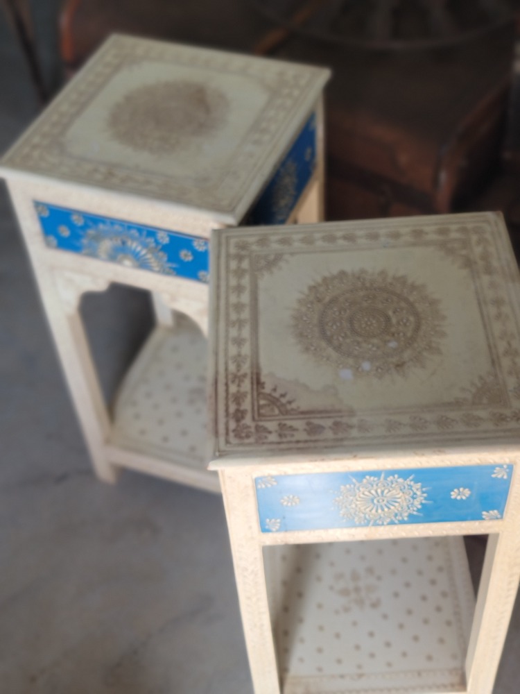 21. White and blue decorative side tables x2.