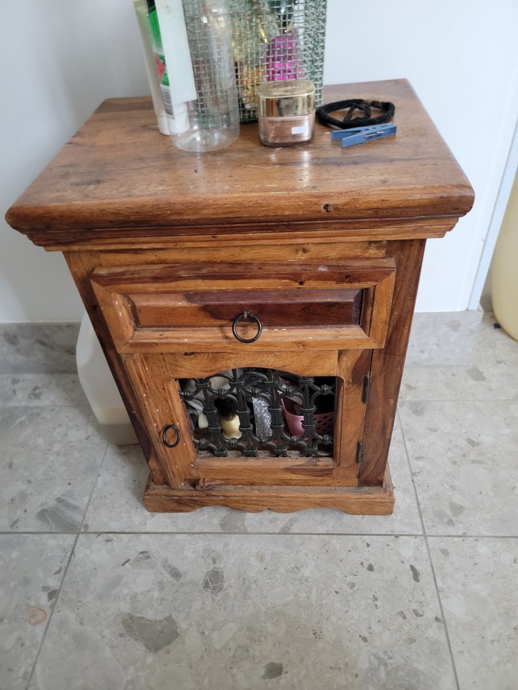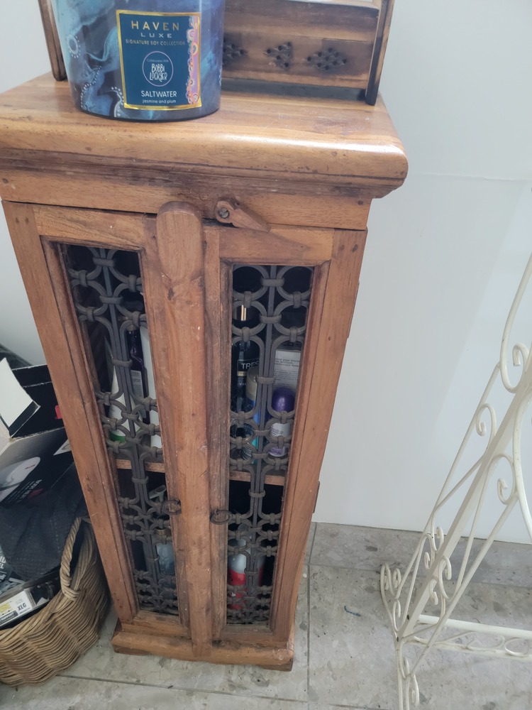 123. Tall, timber cupboard, toiletries inside.
