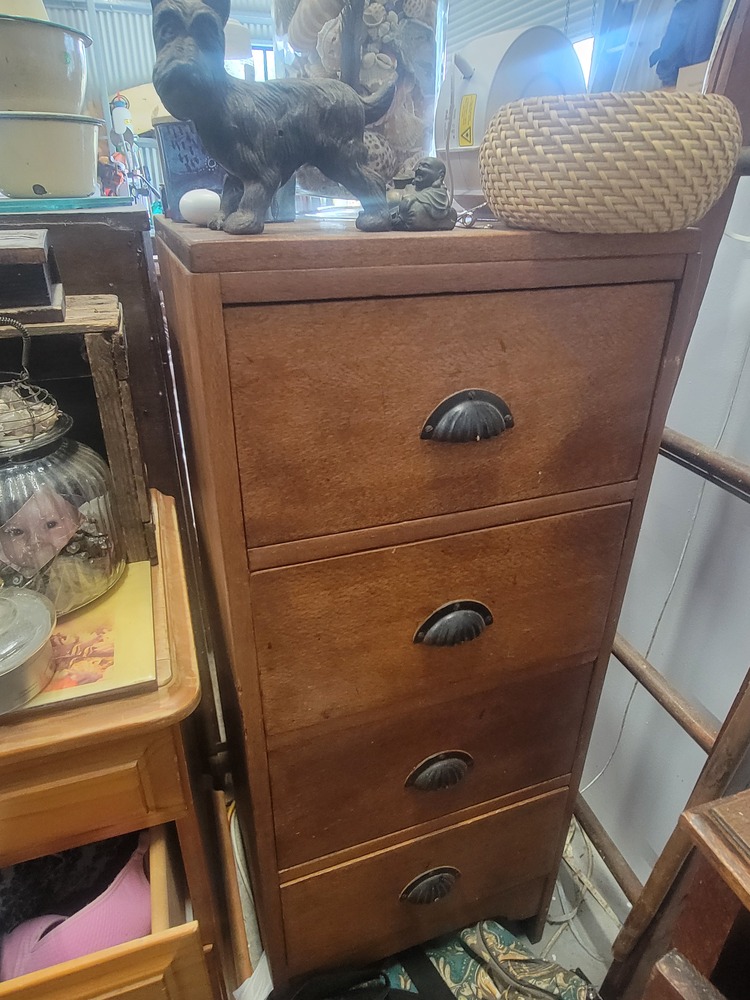 139. Solid timber tallboy with carved dog, budda statue, basket and clock on top.