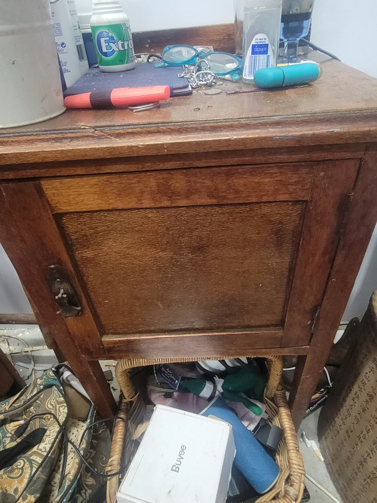 140. Antique, timber bedside table, basket under.