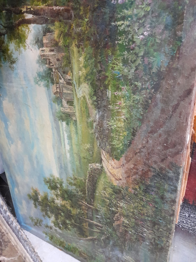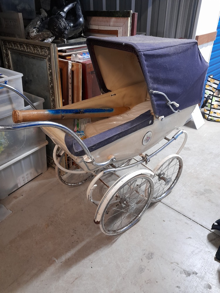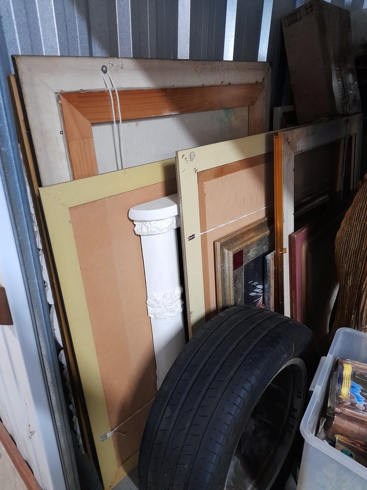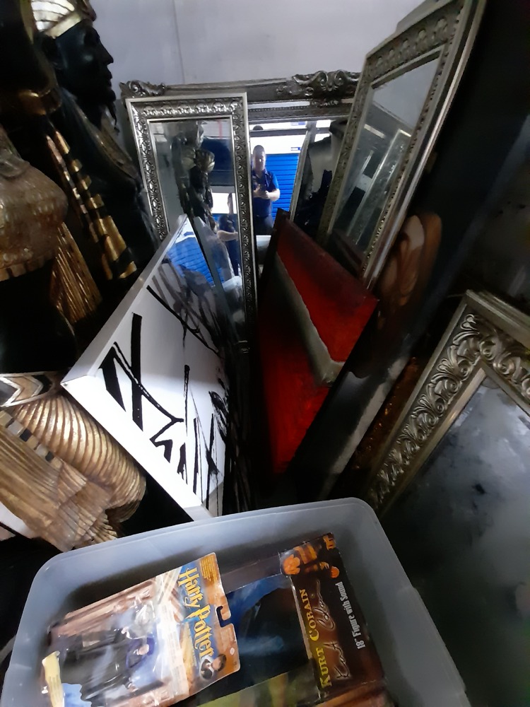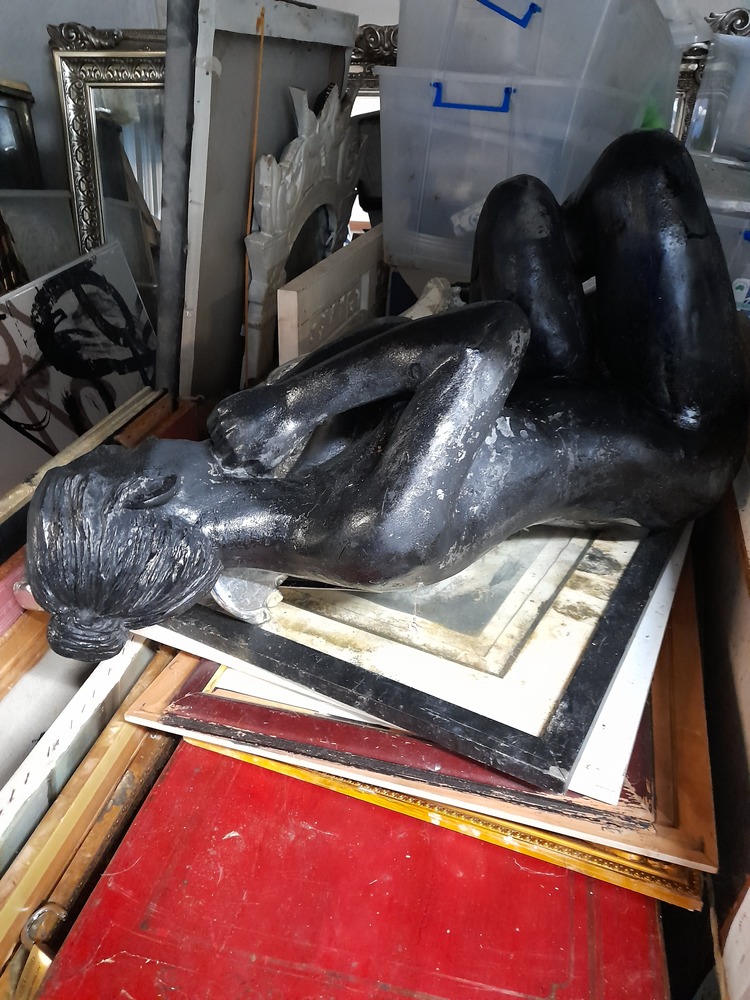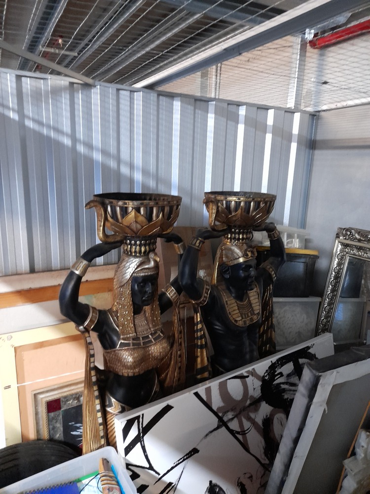 Several Large artwork and mirrors, 2 Egyptian-themes statues, 3 reclining statues, Assorted collectibles, low cabinet, books, a tire and a pram.