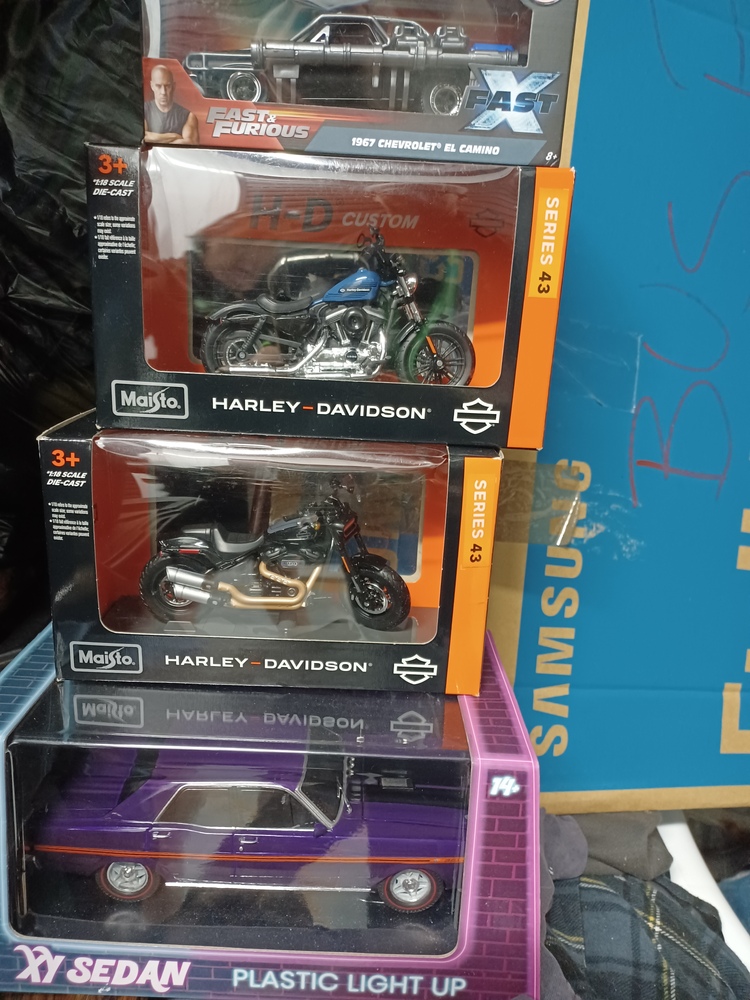 3 Harley Davidson miniature collectables + 2 car miniatures