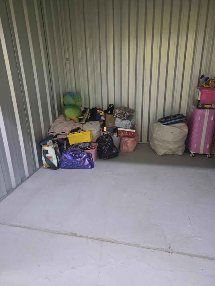 From what we can see inside this unit we have a large TV, kids Items, unopened bags and boxes.