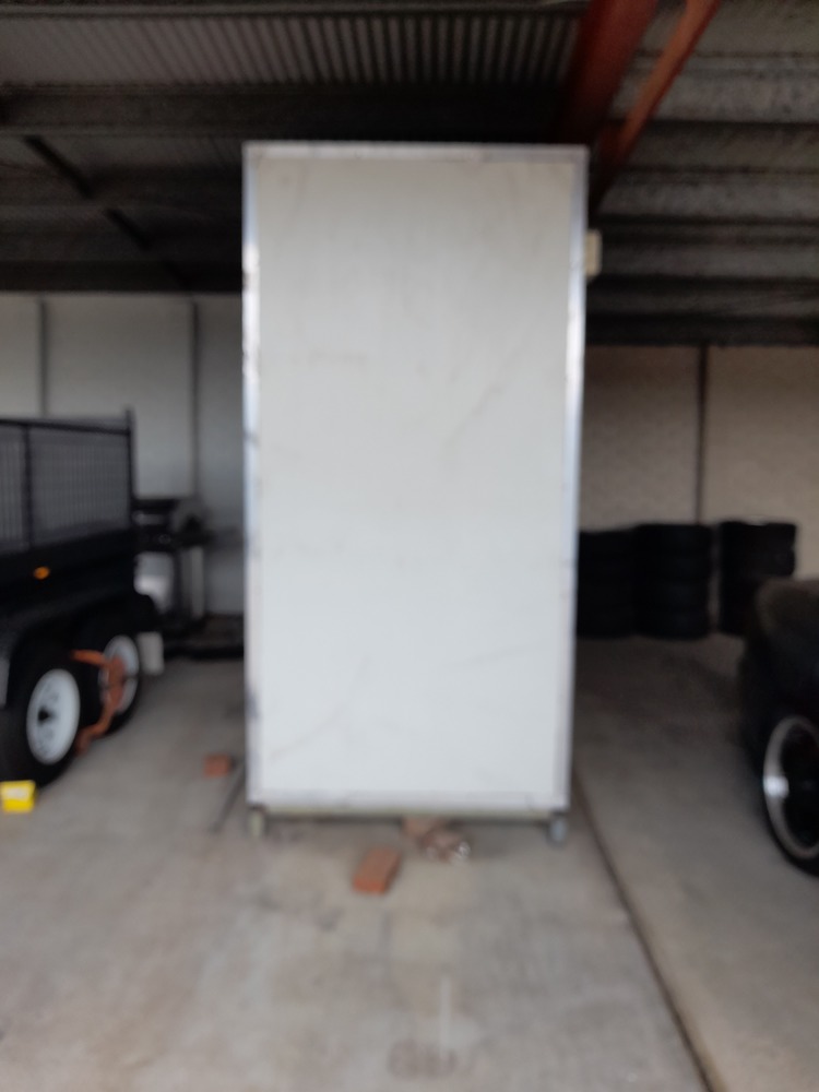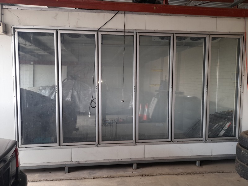 Asset is a free-standing six double-glaze glass door commercial/supermarket fridge, estimated value 4000-5000$ depending on condition and features. Asset has all doors, refrigerating unit, and some loose shelving left inside. Misc goods stored on top of fridge